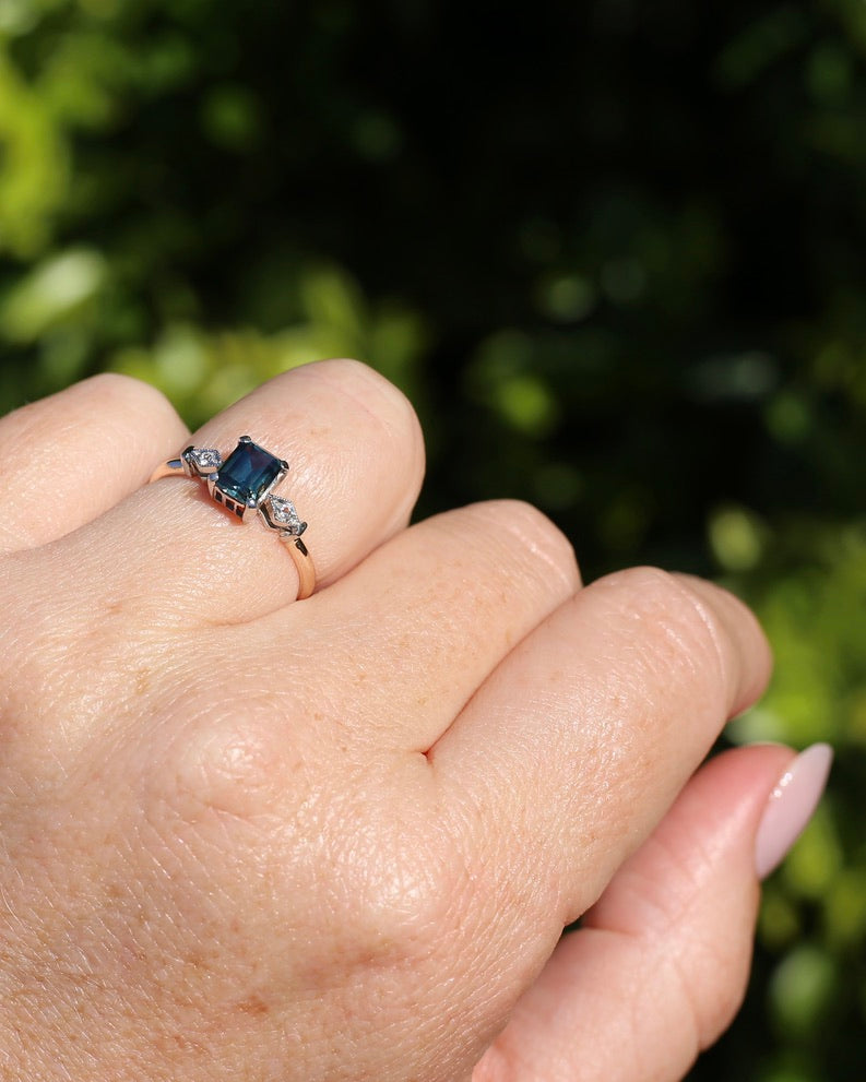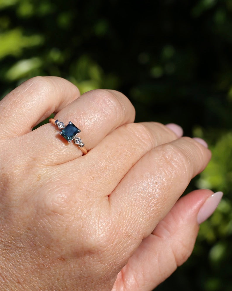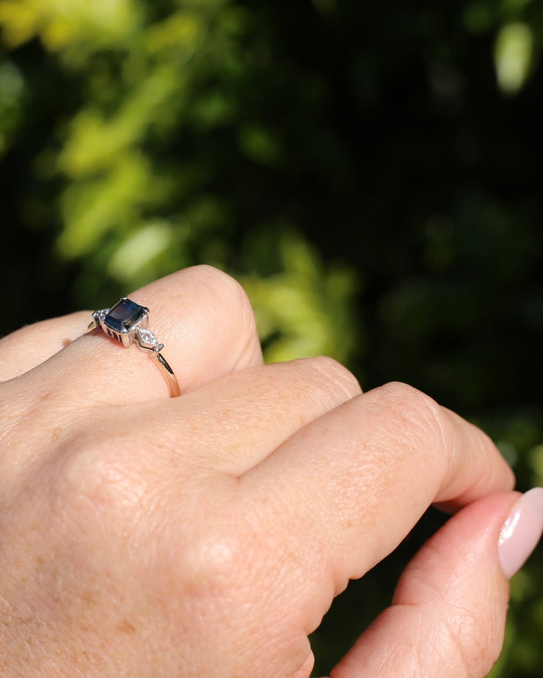 1.09ct Emerald Cut Teal Australian Sapphire With Diamonds in Vintage Trilogy Setting, 9ct Yellow and White Gold, size N1/2 or 6.75, 2.05g