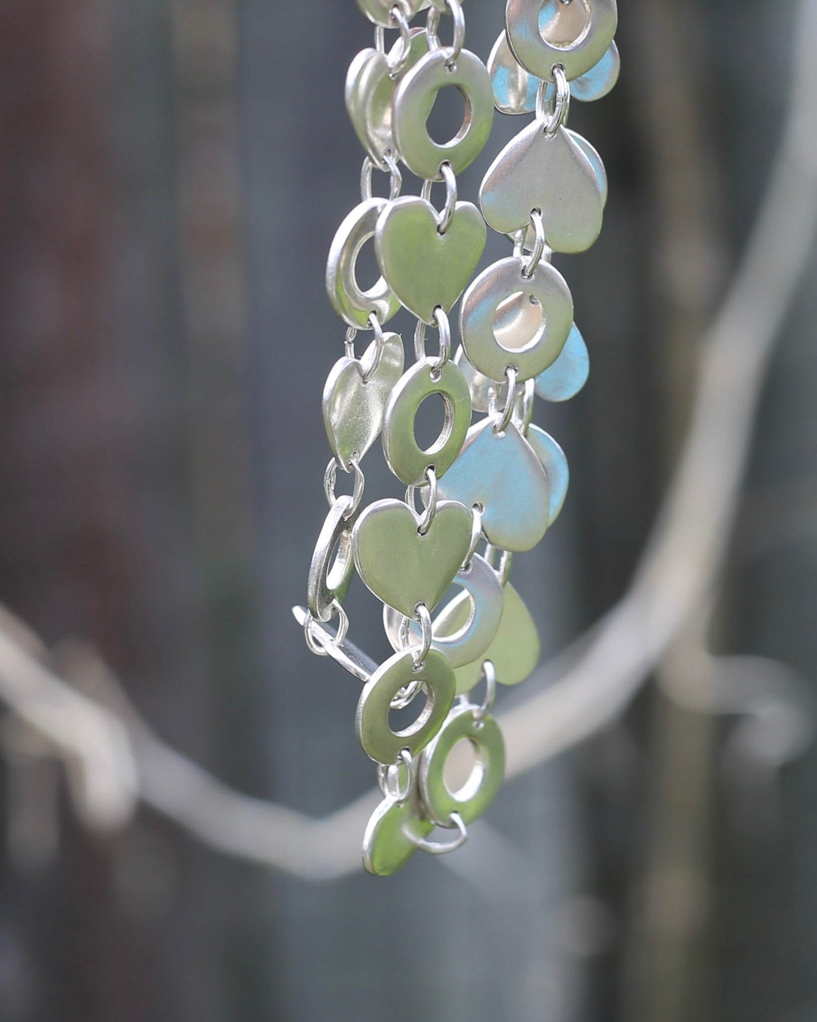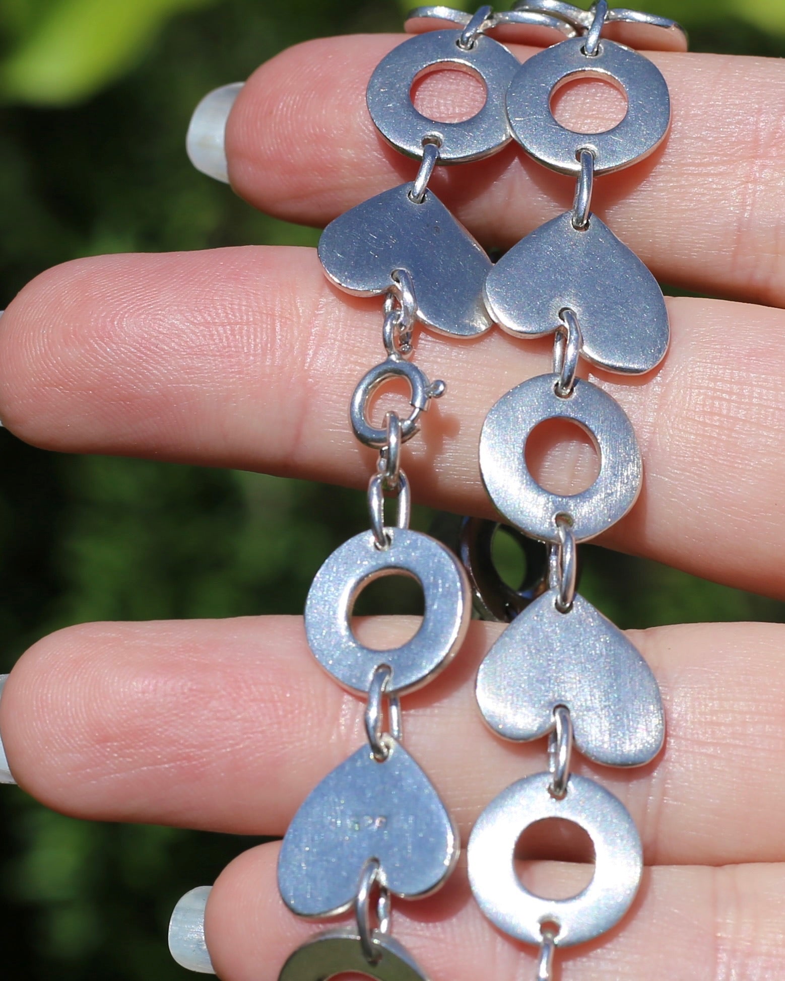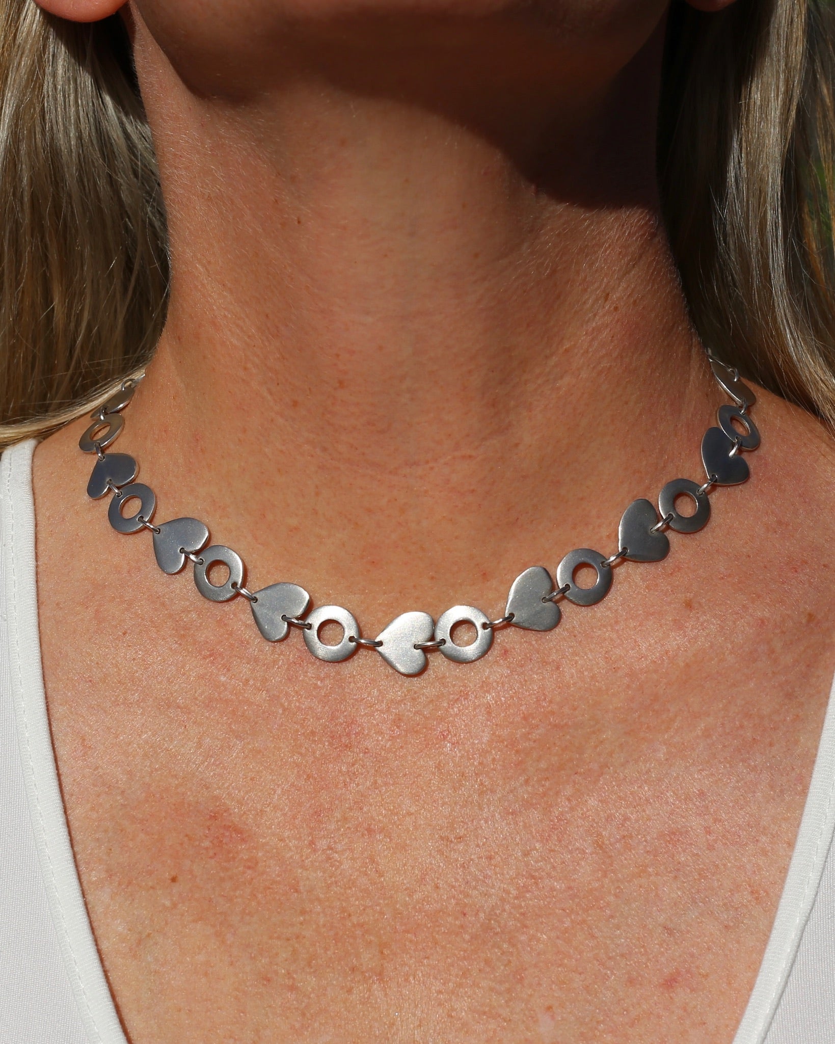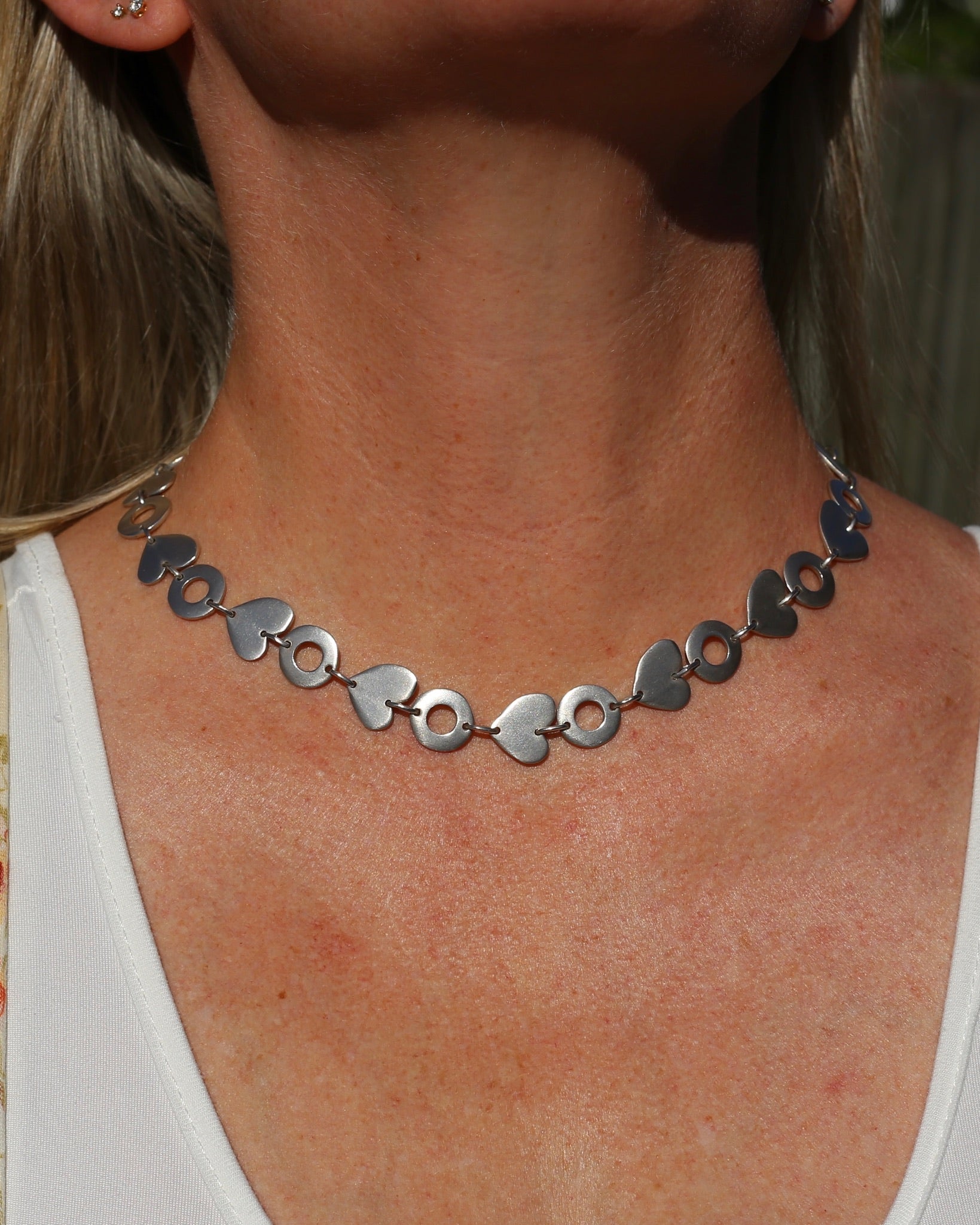 Modernist Danish Silversmith Hans Hansen is renowned for his hearts necklaces. And they have become such a vibe. This is not a Hansen - but we love the inspiration and the handcrafted hearts in their imperfect shapes. Split by ciricles of silver - there was also a heavy modernist movement in the lilypad design. We like to see this fabulous choker as a mixing of these two designs and we just love how it looks and feels on the neck.