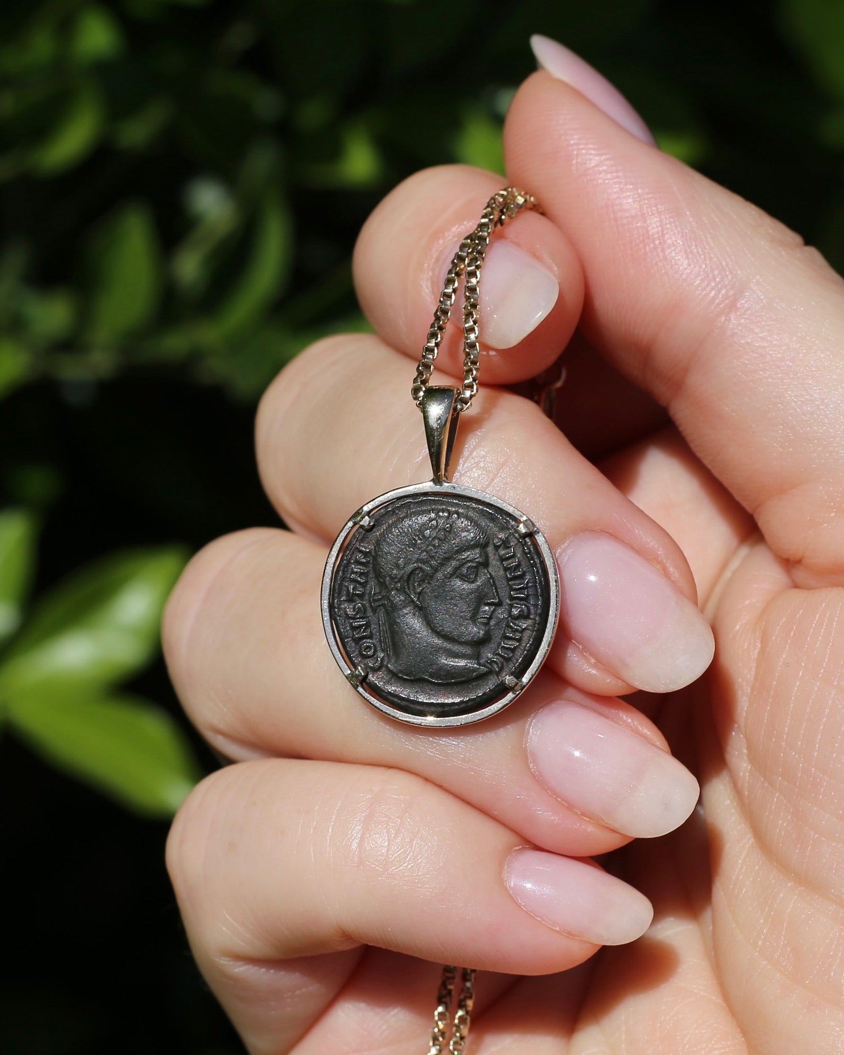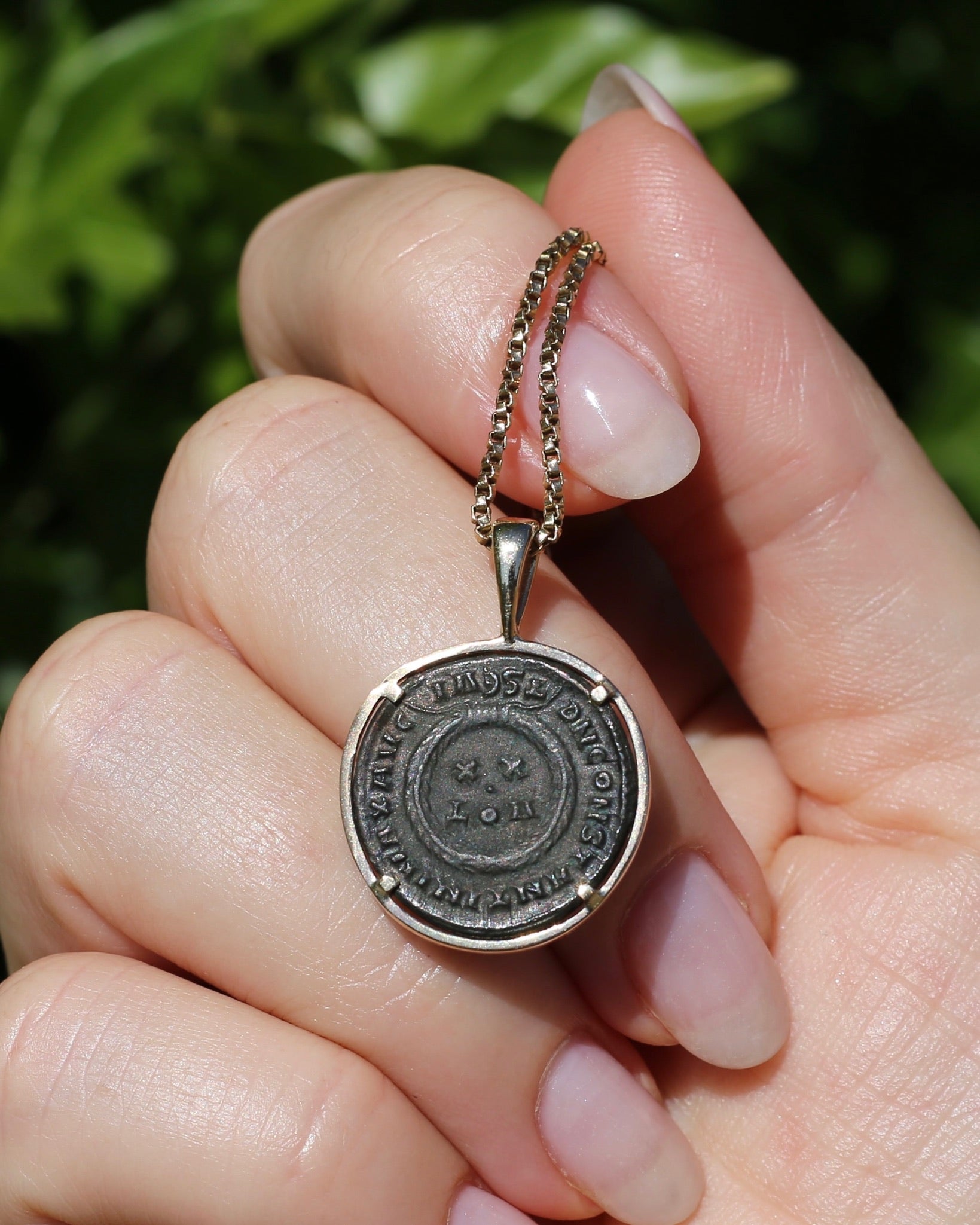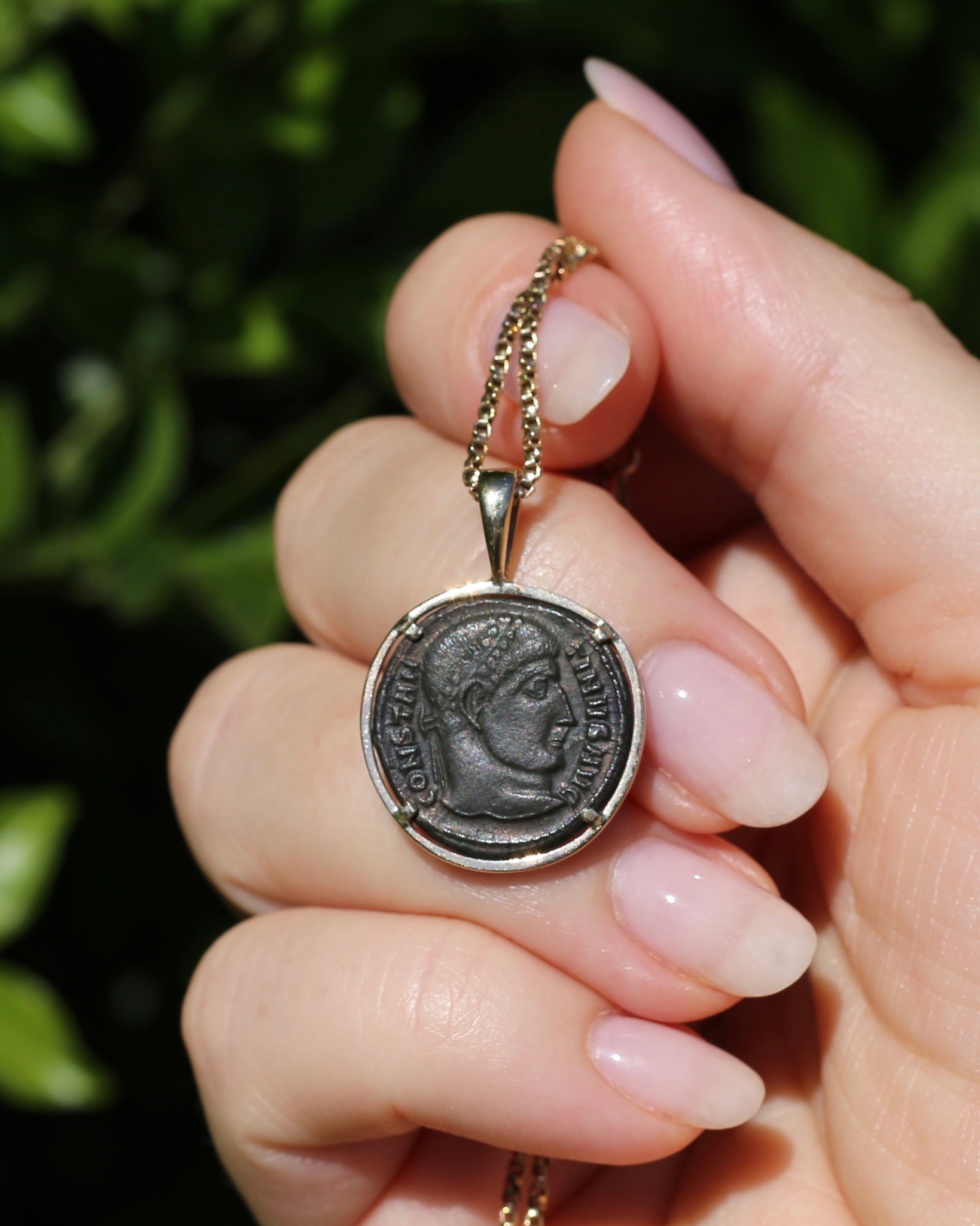 Constantine the Great - famed for bringing Christianity to Rome, and for the city of Constantinople which was re-named in his honour. As the crucial city that joined Asia and Europe (what is now called Istanbul) this shows the power of this man and the impact he had then, and now! This amazing bronze coin is fabulously clear - with Constantine's profile on the front, and the latin for "Our Lord Constantine, Great Emperor" surrounding him. The back has the laurel wreath we have all long associated with roman rule and words and dates of production (hence being able to date it). We love the darkness of the coin, the precision and detail of the imprints and against the 9ct gold it glows.