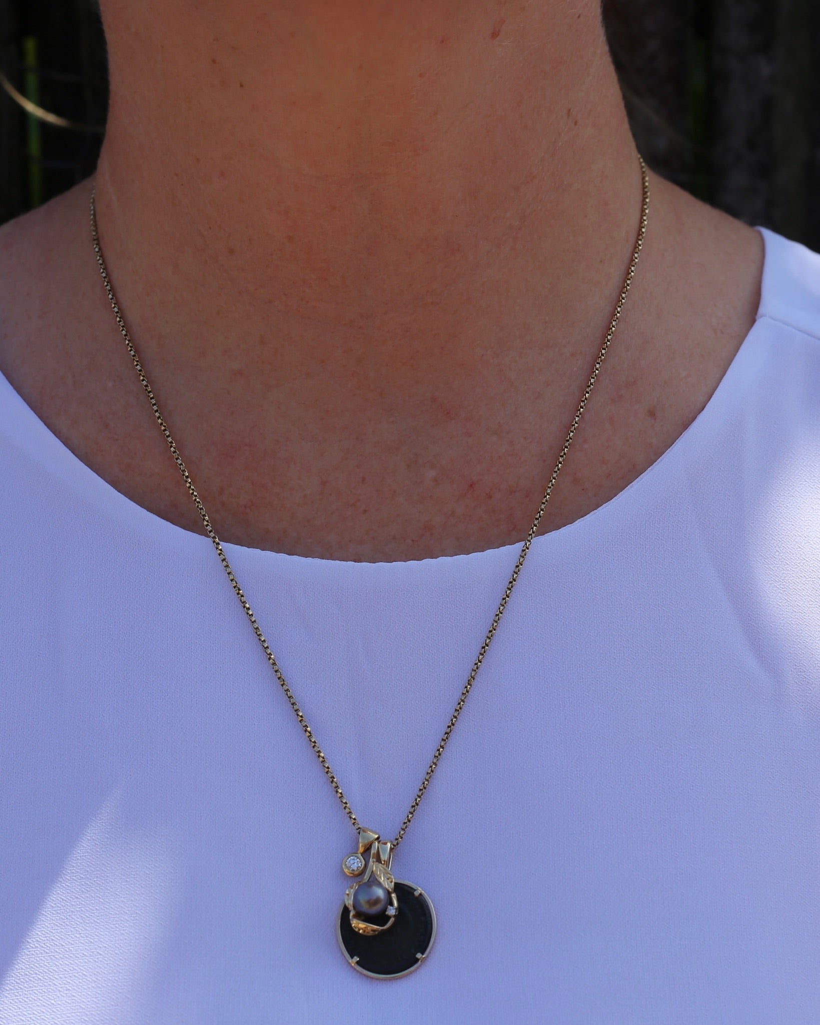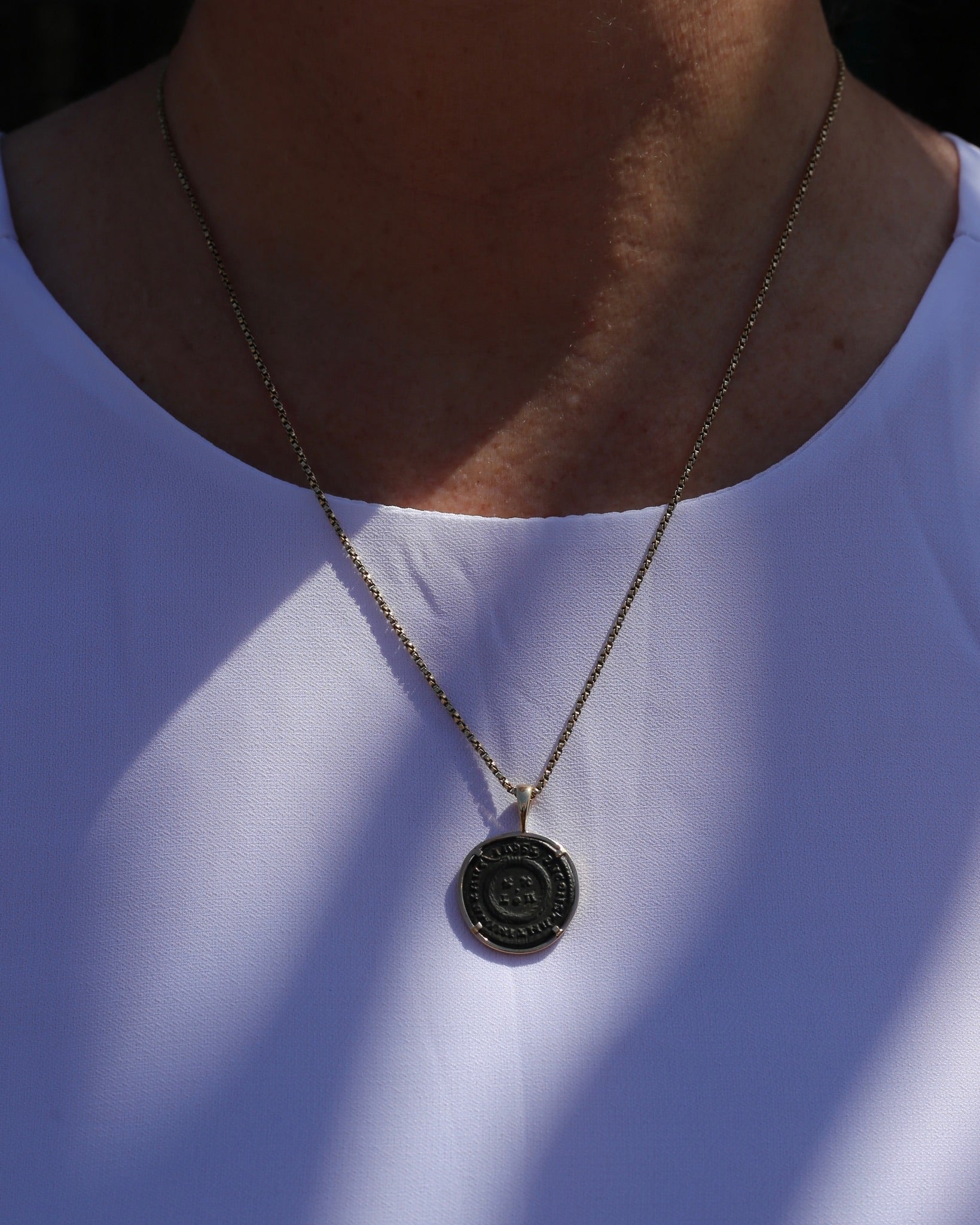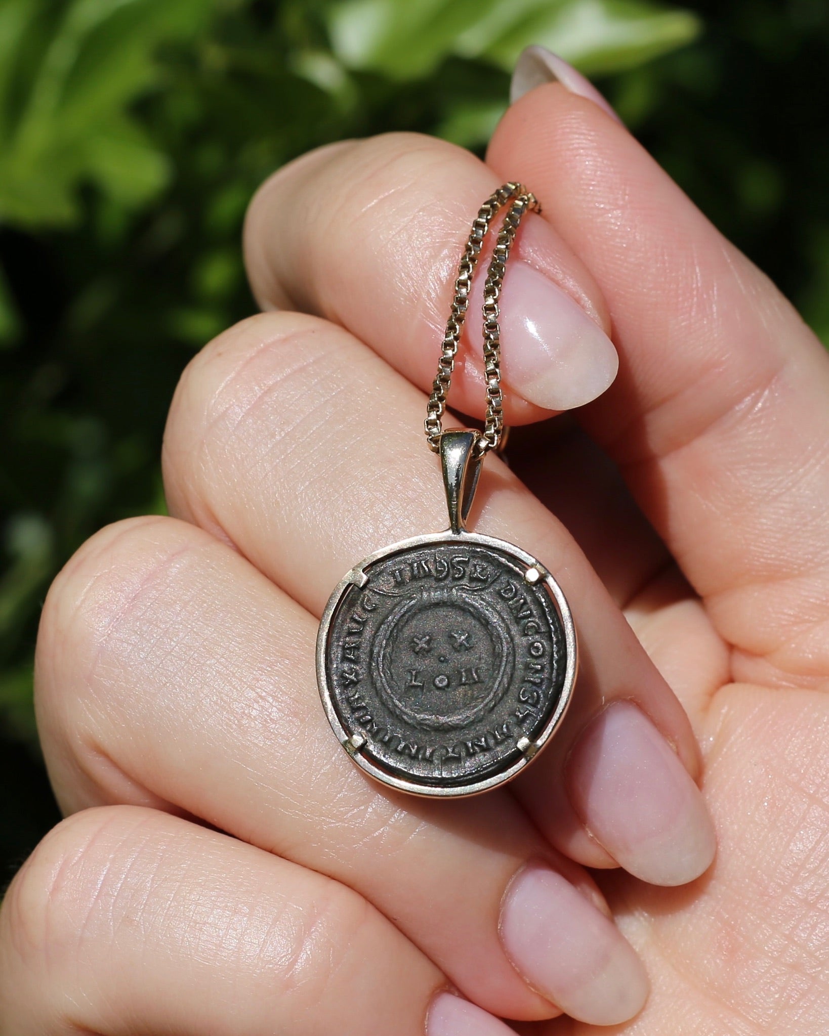 Constantine the Great - famed for bringing Christianity to Rome, and for the city of Constantinople which was re-named in his honour. As the crucial city that joined Asia and Europe (what is now called Istanbul) this shows the power of this man and the impact he had then, and now! This amazing bronze coin is fabulously clear - with Constantine's profile on the front, and the latin for "Our Lord Constantine, Great Emperor" surrounding him. The back has the laurel wreath we have all long associated with roman rule and words and dates of production (hence being able to date it). We love the darkness of the coin, the precision and detail of the imprints and against the 9ct gold it glows.