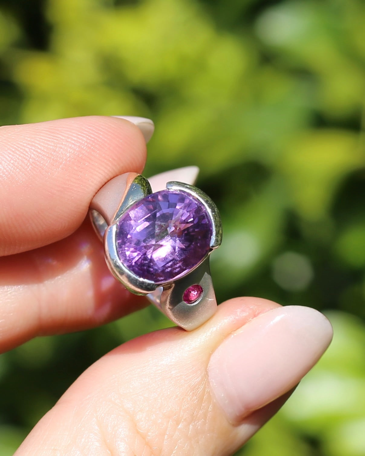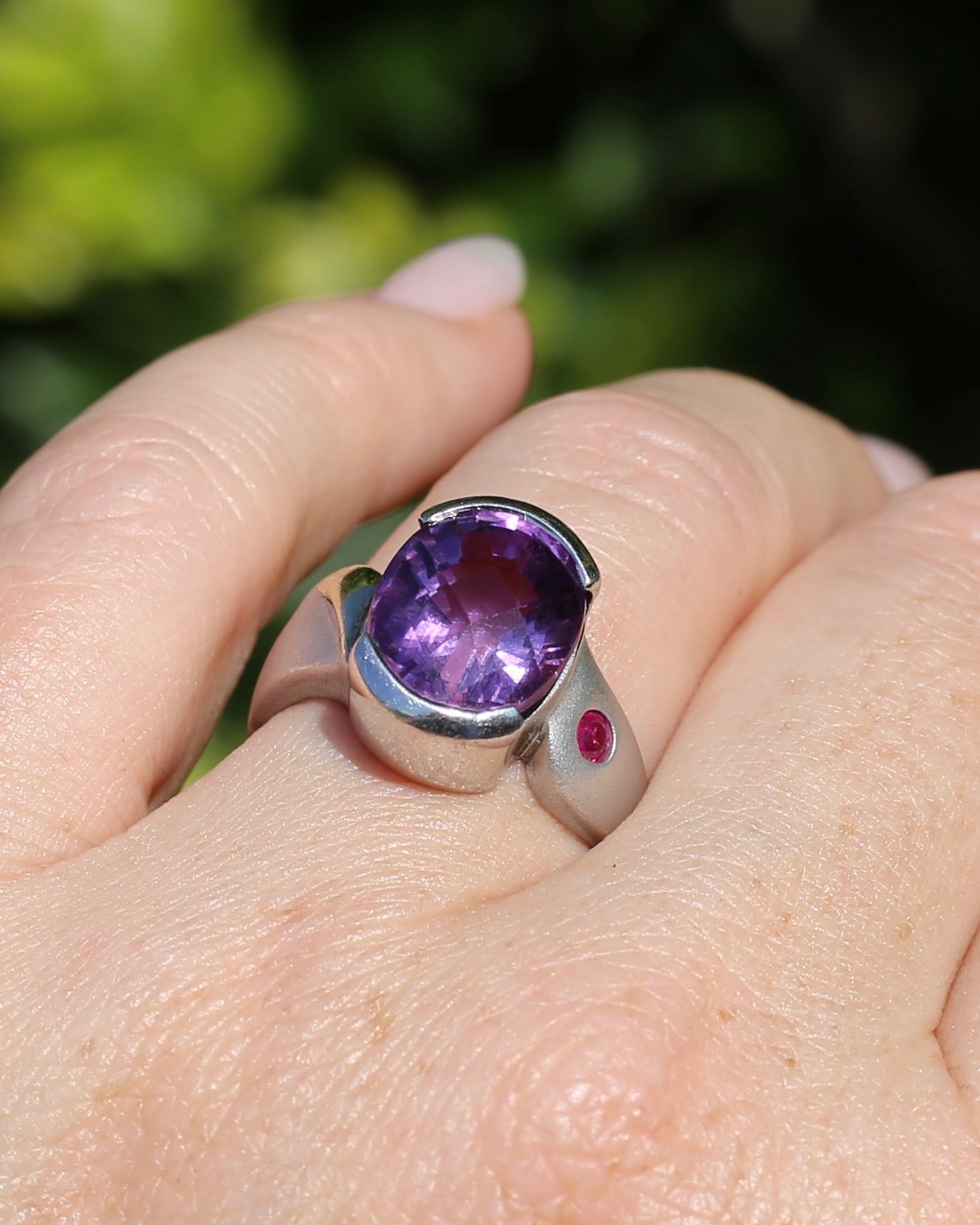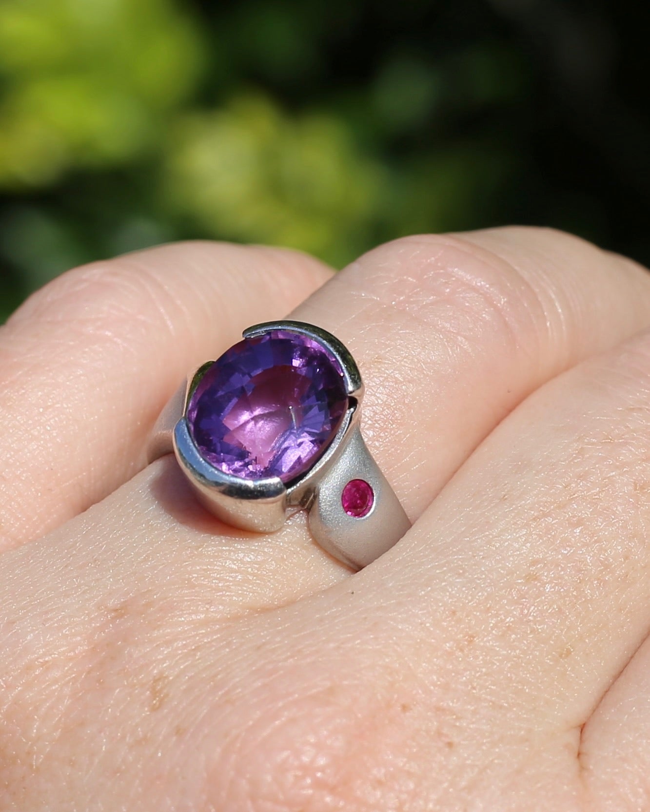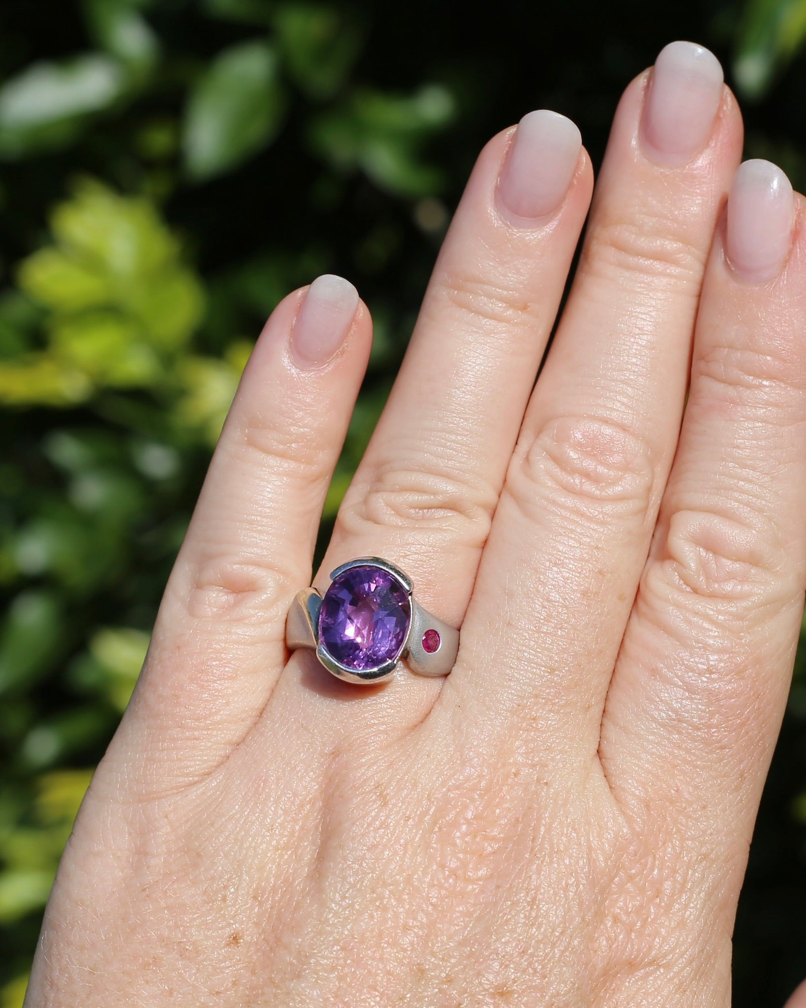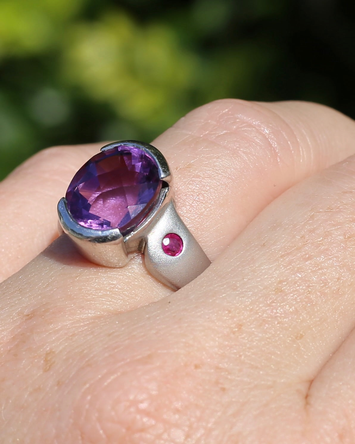 Harlequin Cut Oval Amethyst and Ruby Ring with Brushed Finish and Gold Plating Detail, 9.1g, size P1/2 or 8