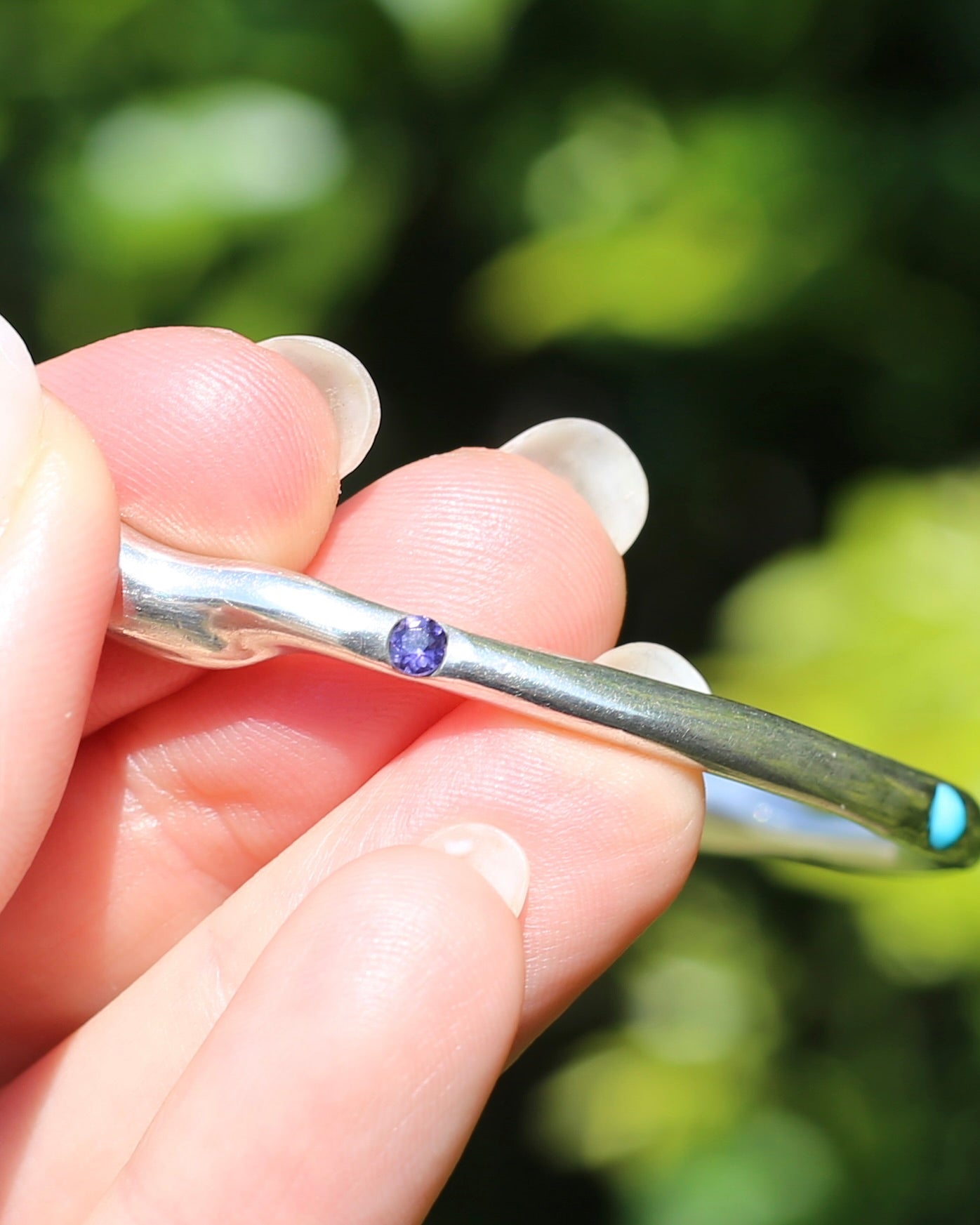 These freeform bangles are a really popular way to use reclaimed metals and use stones that are of significance to the owner. This may well be one of these, although they are also popular enough to be made to be sold as unique pieces. This features white sapphires (likely synthetic), blue topaz, a tanzanite or iolite, and a couple we are unsure of - the turquoise cabochon is not natural and the cloudy blue green could be a number of different stones - something in the quartz family or beryl family at best guess.