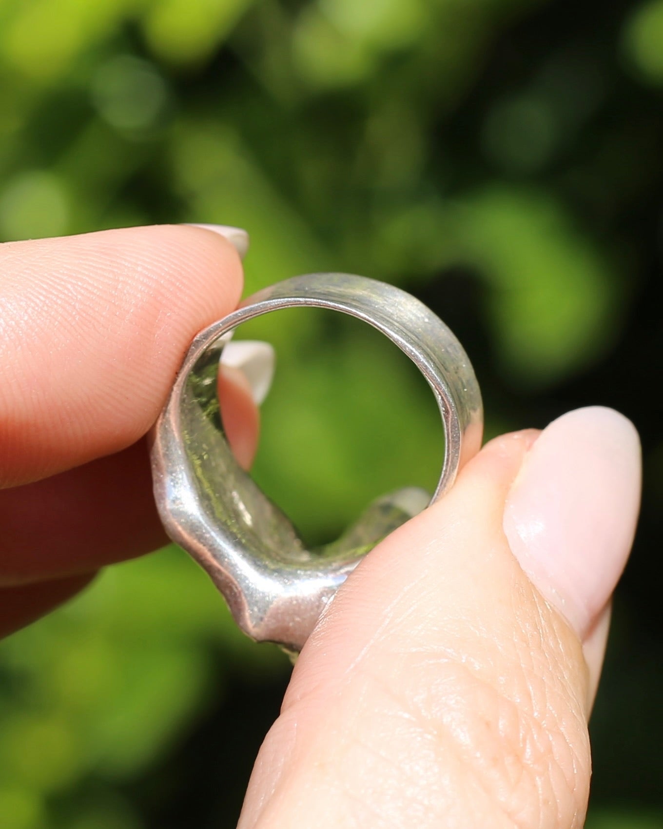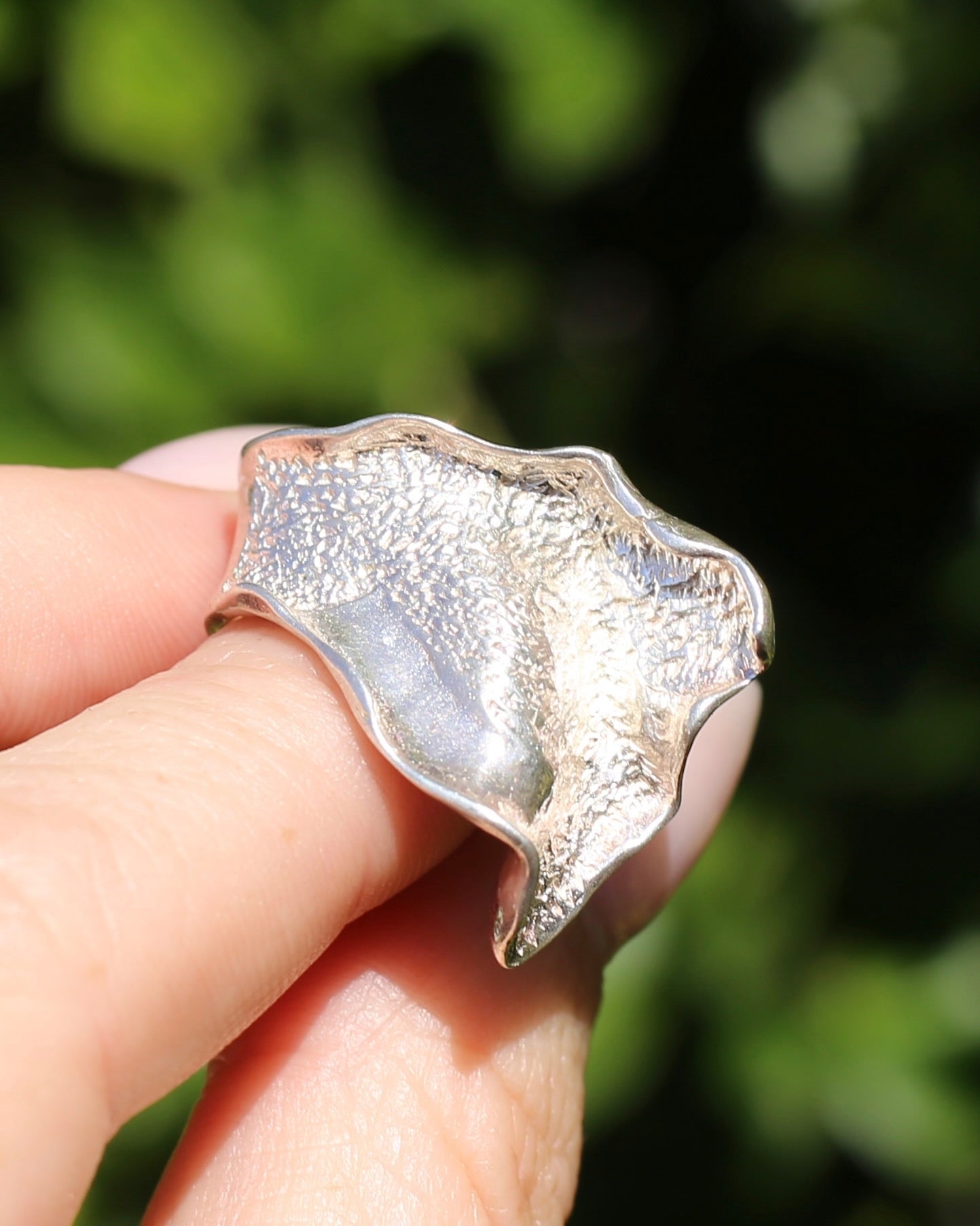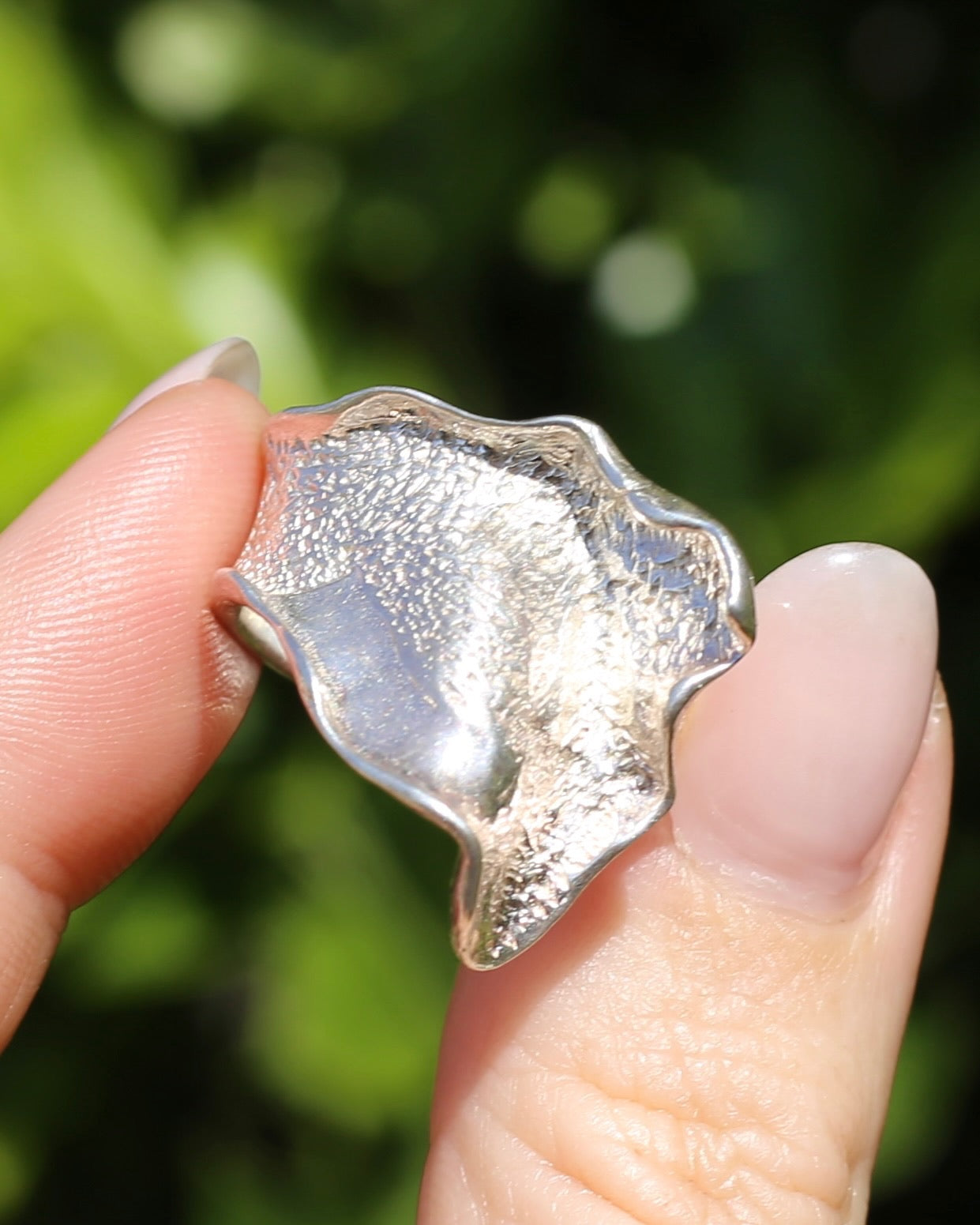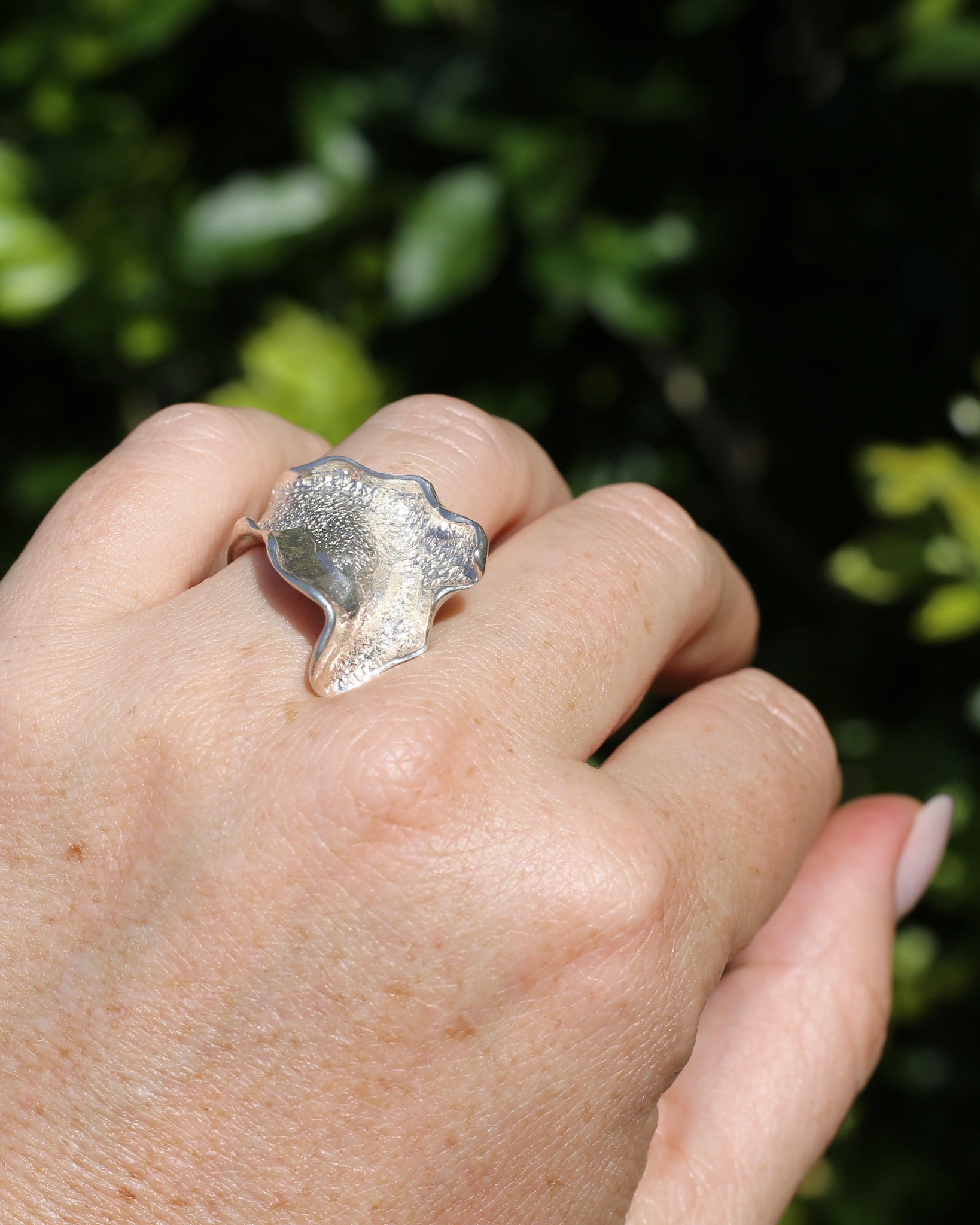Modernist silver of textures and rustic shapes and forms. These elegant lines and the way the crinkled edges and textured internal catches the light is magical. We love the architectural feels of the ring and how elegant it looks on the hand. Make a statement in simple elegant silver.