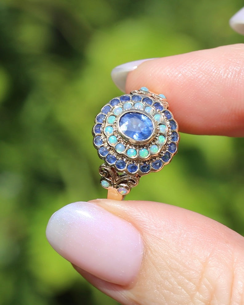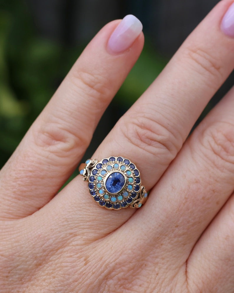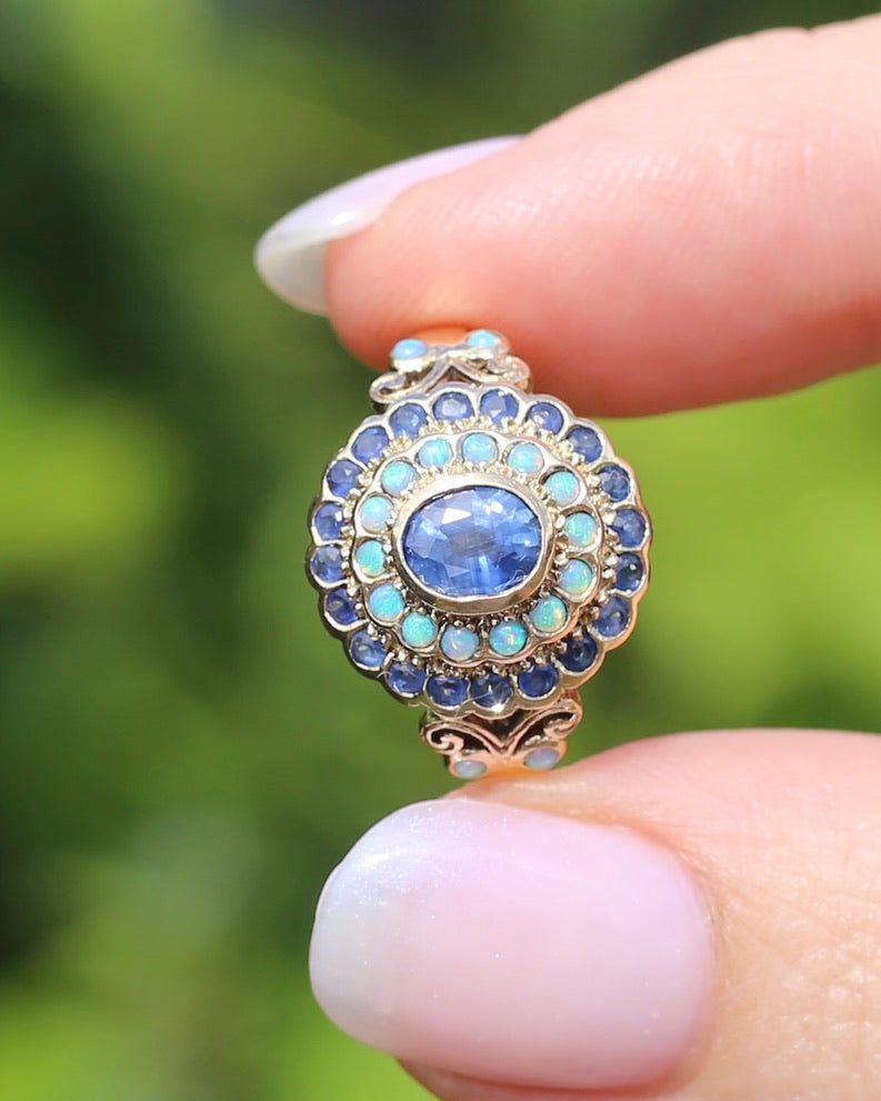 Some rings just shout for attention, they glisten and sparkle and dance in fabulous colours that mean you can't stop looking at them. This fabulous ring features a central natural blue sapphire with bezel (and claw) set halos of natural opals and more blue sapphires. This makes this ring a show stopper. Between the raised layers of gold, the colours of those opals and the bright blues of the sapphires we are smitten. The scroll and further swirl detail of the shoulders (set with two more opals in each) mean that from every angle this ring is a delight.