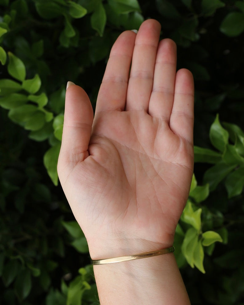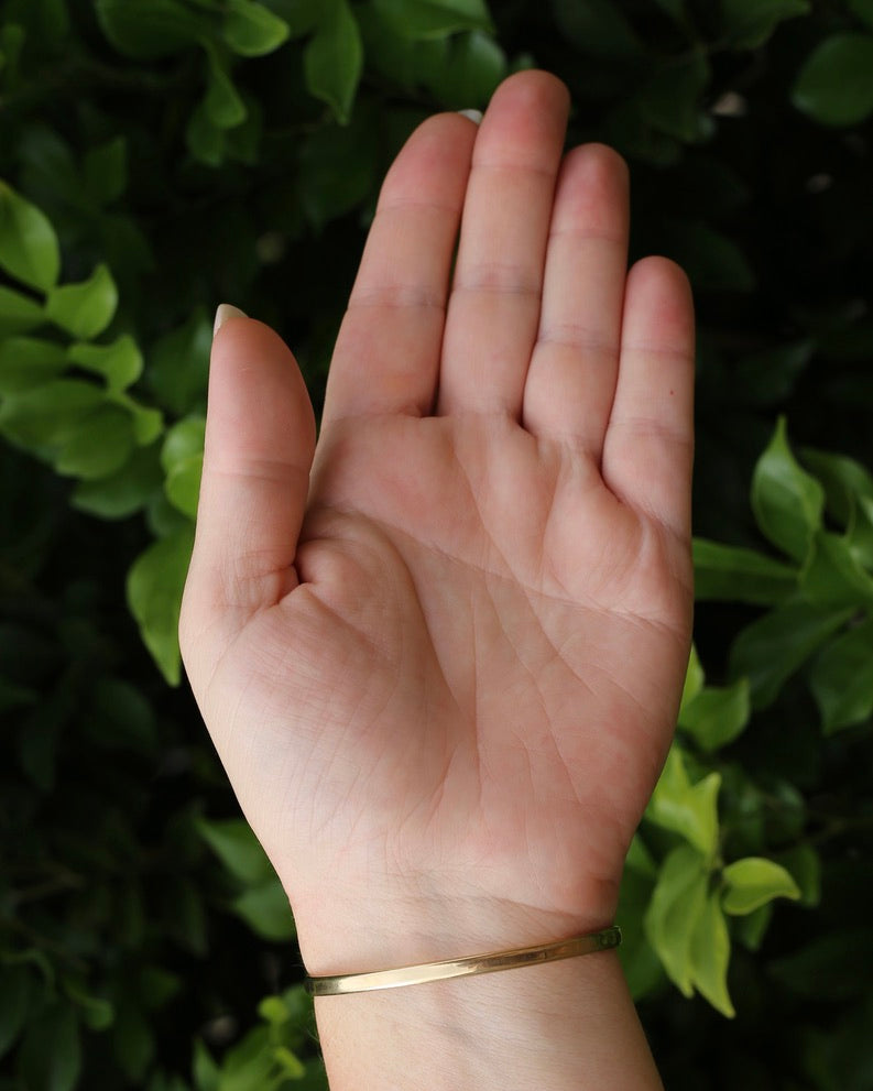 A glorious slightly rosey gold low profile oval bangle - the almost flat top catches the light and is magnificent on the hand. The smallest of the three this is a lovely snug fit on the wrist and a lovely rosey yellow gold colour.
