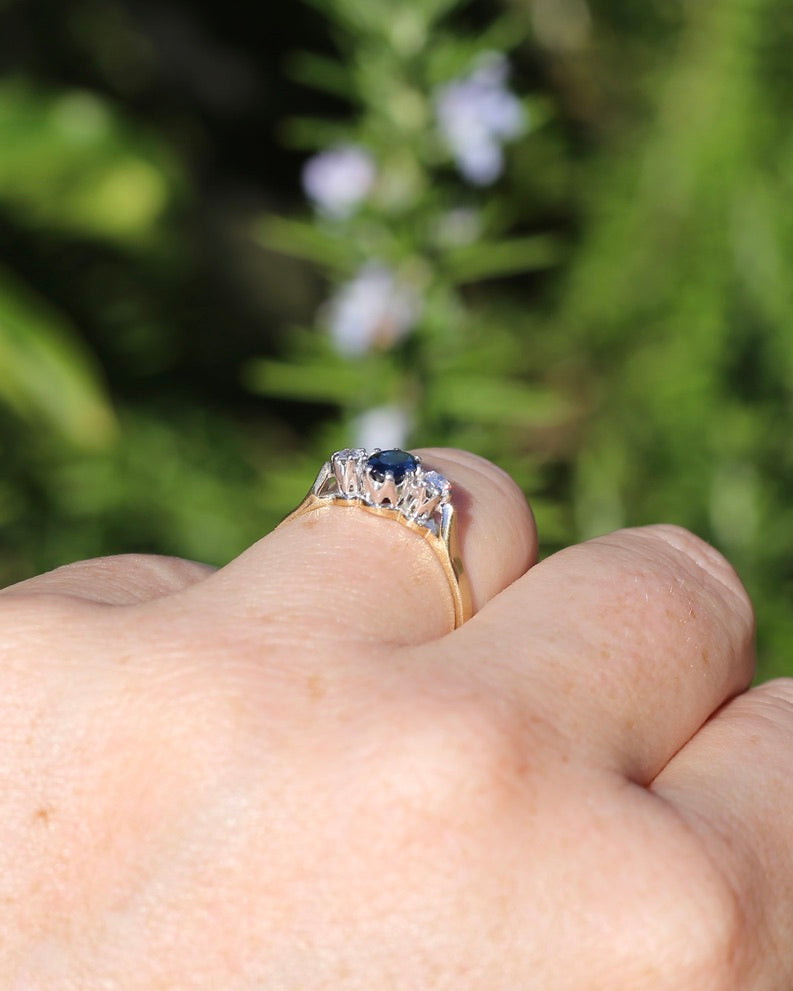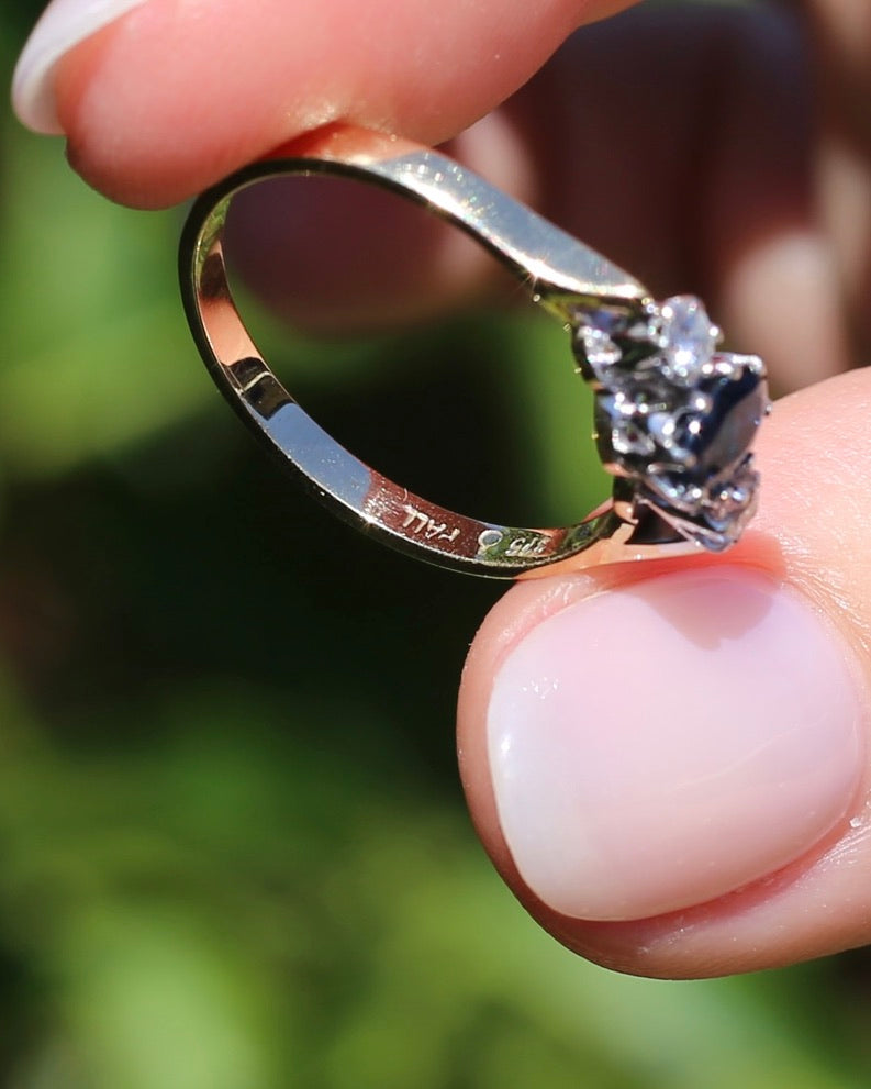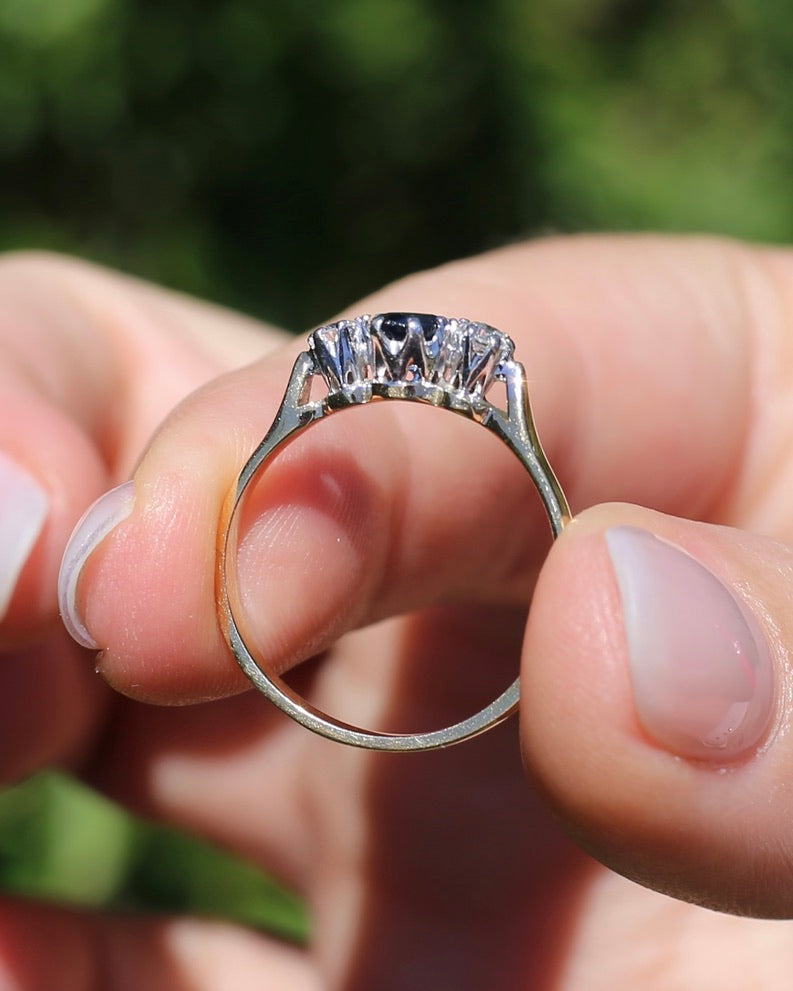 This beautiful mixed metal trilogy has some fantastic vintage features that we just love! First the metal choice - the head is made of palladium - a metal seen rarely. It was use regularly during WW2 as platinum was so required for the war, and so palladium was seen more regularly - but this little beauty is not that old. This was made post 1973 (thanks to the "375" hallmark for the gold) so it is a fab and unique choice. It is a white metal that does not need rhodium plated to keep its colour - and we love the irregular. Set in this ring is a fab oval sapphire - we have priced it as synthetic - but are pretty certain it is natural.