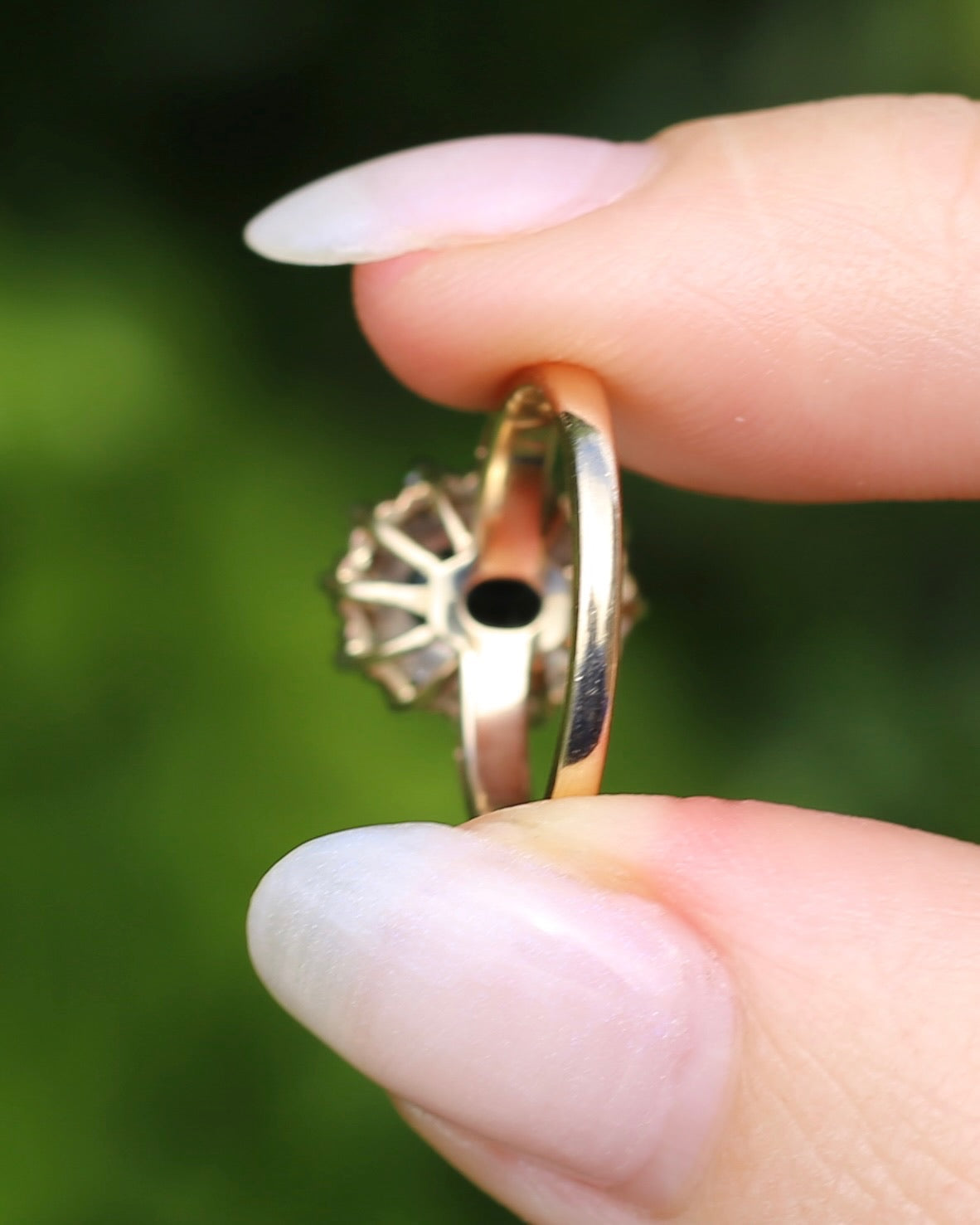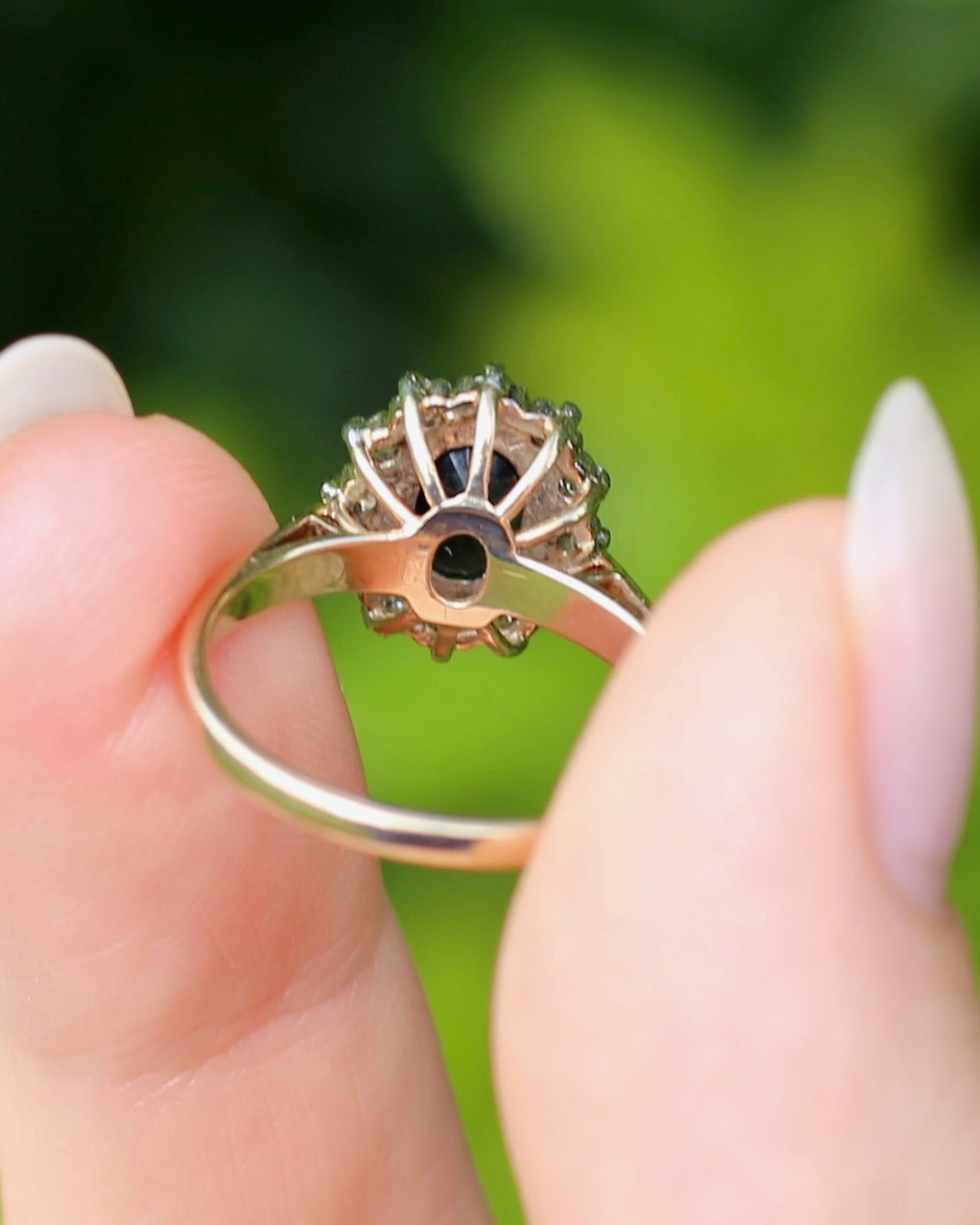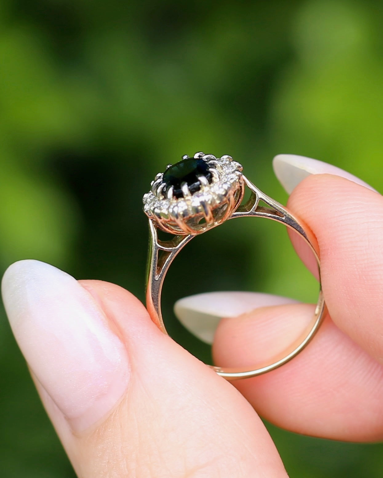 Vintage Natural Sapphire and Diamond Halo, 9ct Yellow and White Gold, size N1/2 or 7