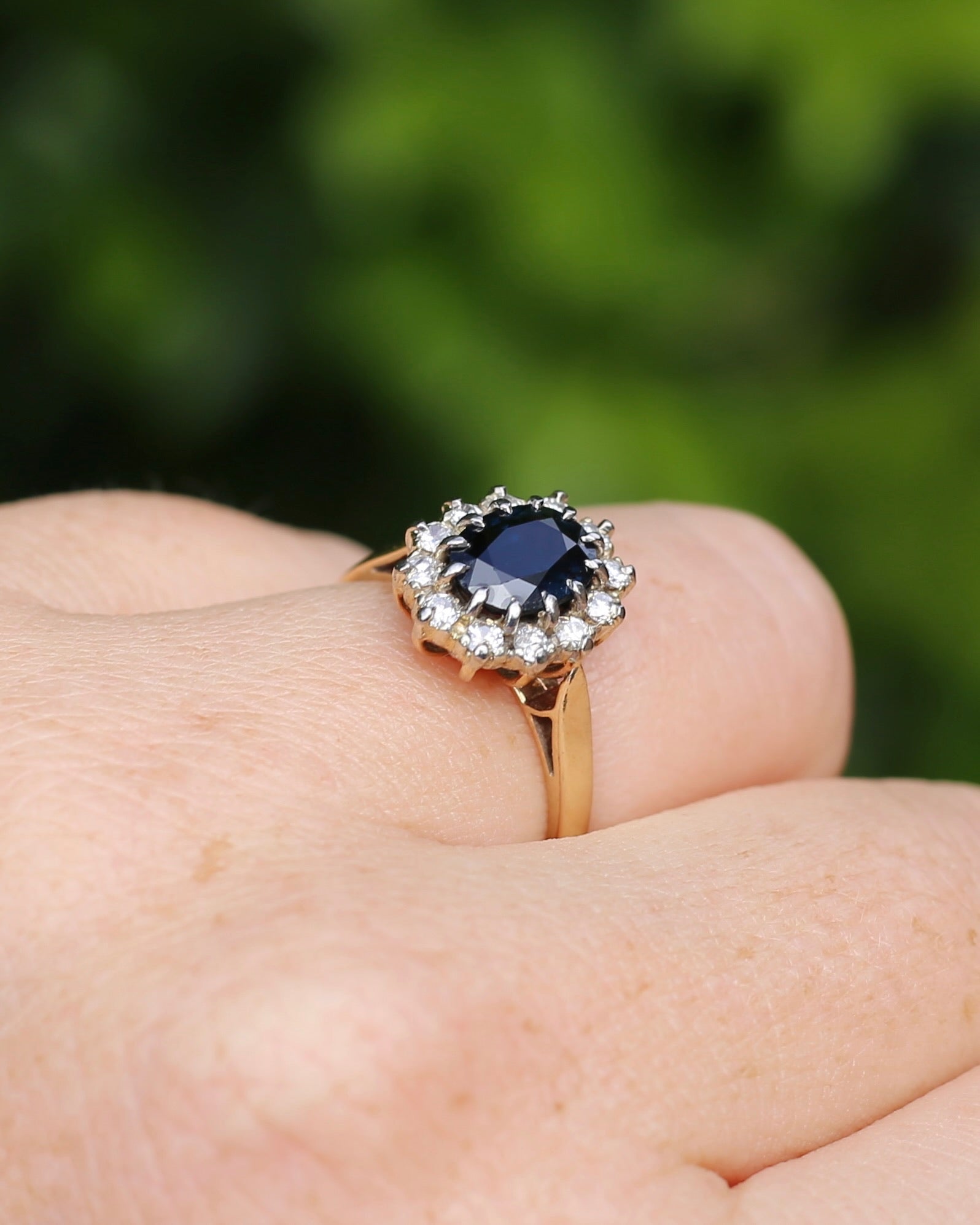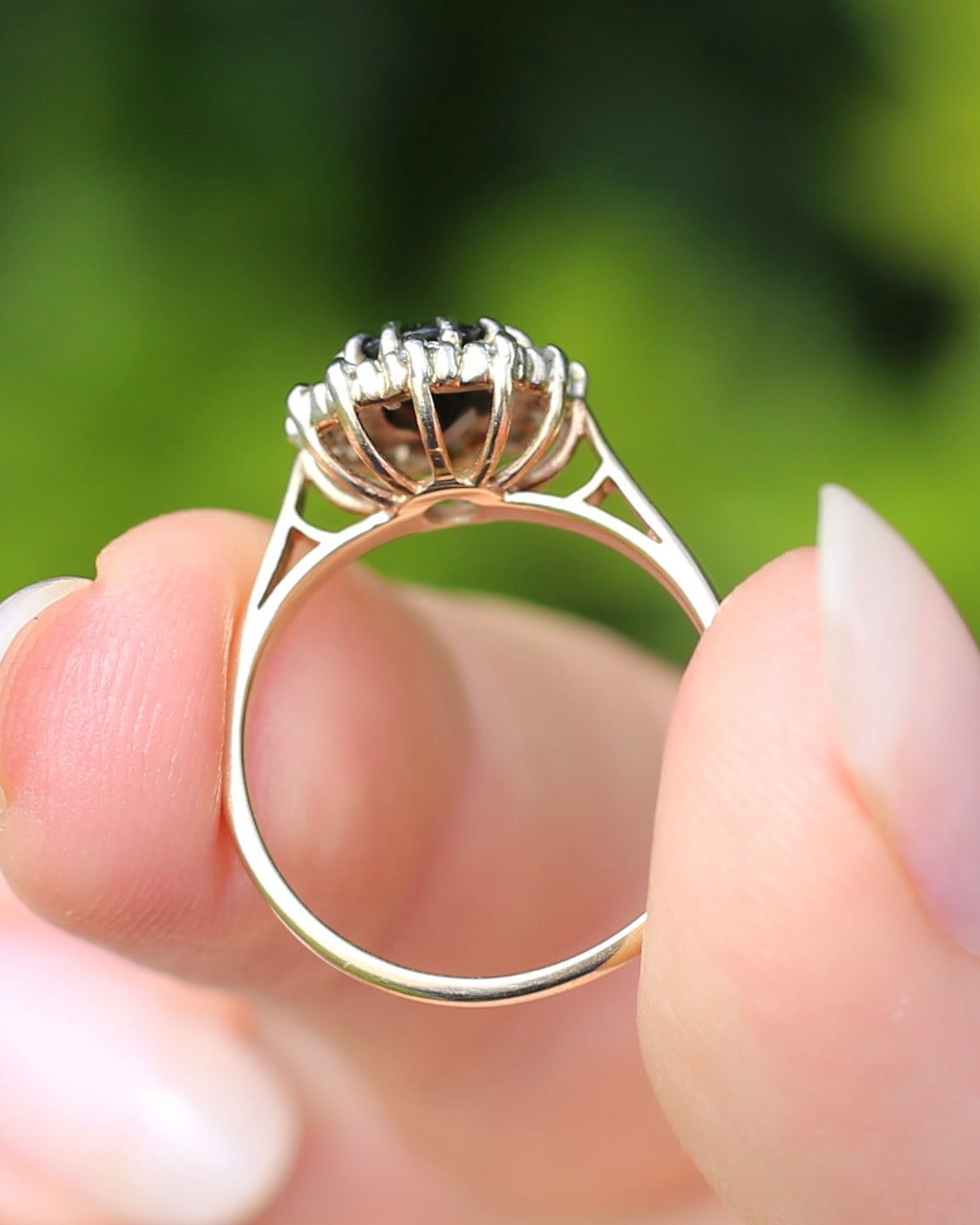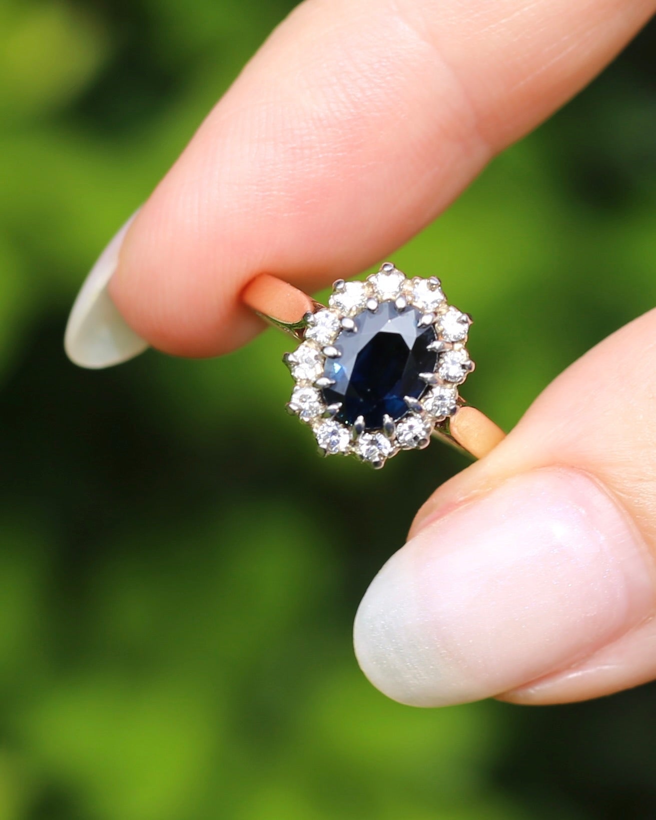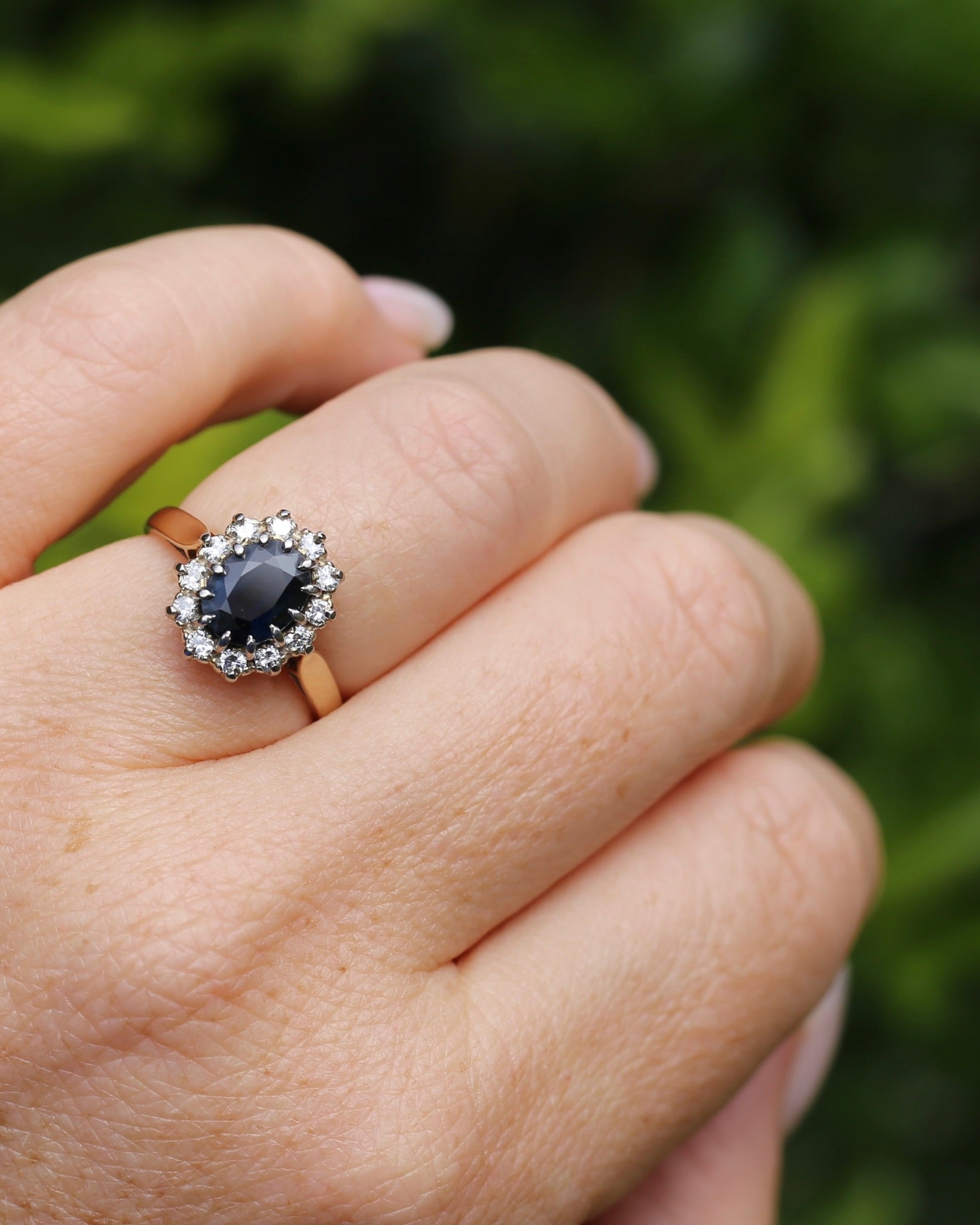 Without question - one of the most iconic rings of the later part of the Twentieth Century - was the ring made famous by Diana. The amazing sapphire and diamond halo is a classic and remains widely popular as a style. This particular version is vintage - pre 1973 - so will pre-date the Diana - but just look at that dark and fabulous stone with flashes of royal and teal blue (tells us this is a natural stone and likely Australian - same as those hallmarks) Claw set in white gold that sapphire is such a great size and shape (and in lovely condition for its age). Surrounding it are 12 brilliant cut diamonds in a lovely tight halo. Set on a yellow gold band we love the contrast of white and blue stones and the buttery yellow gold.