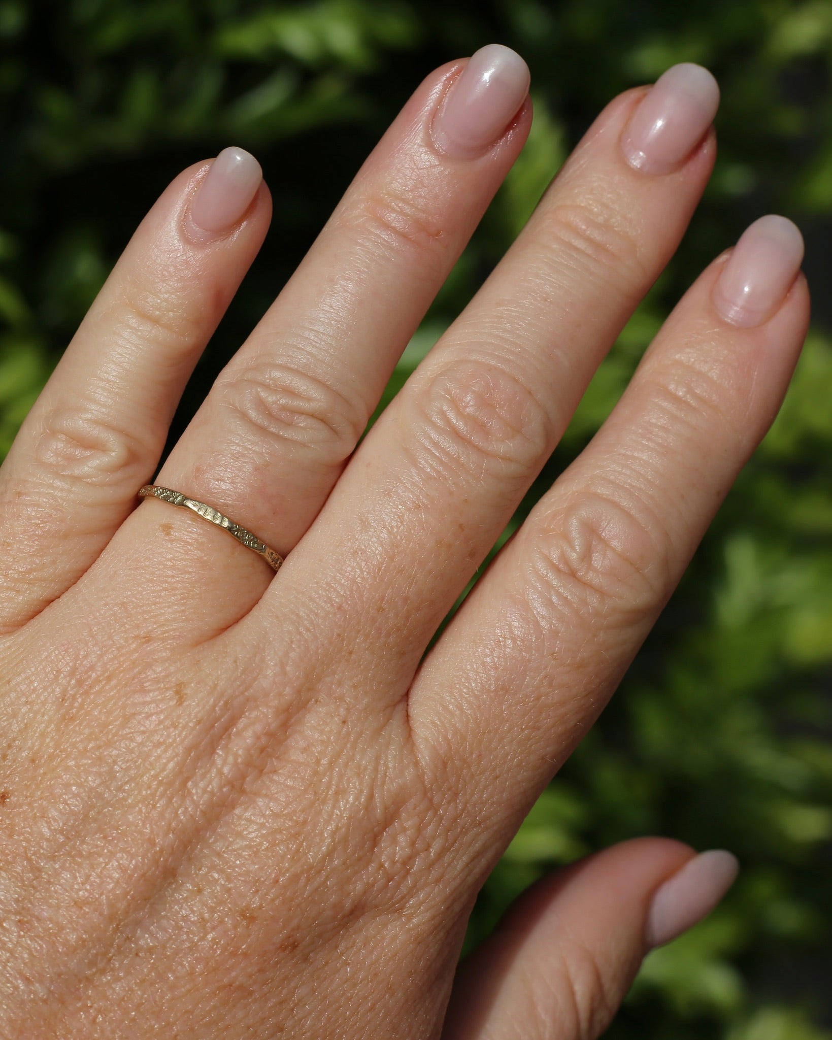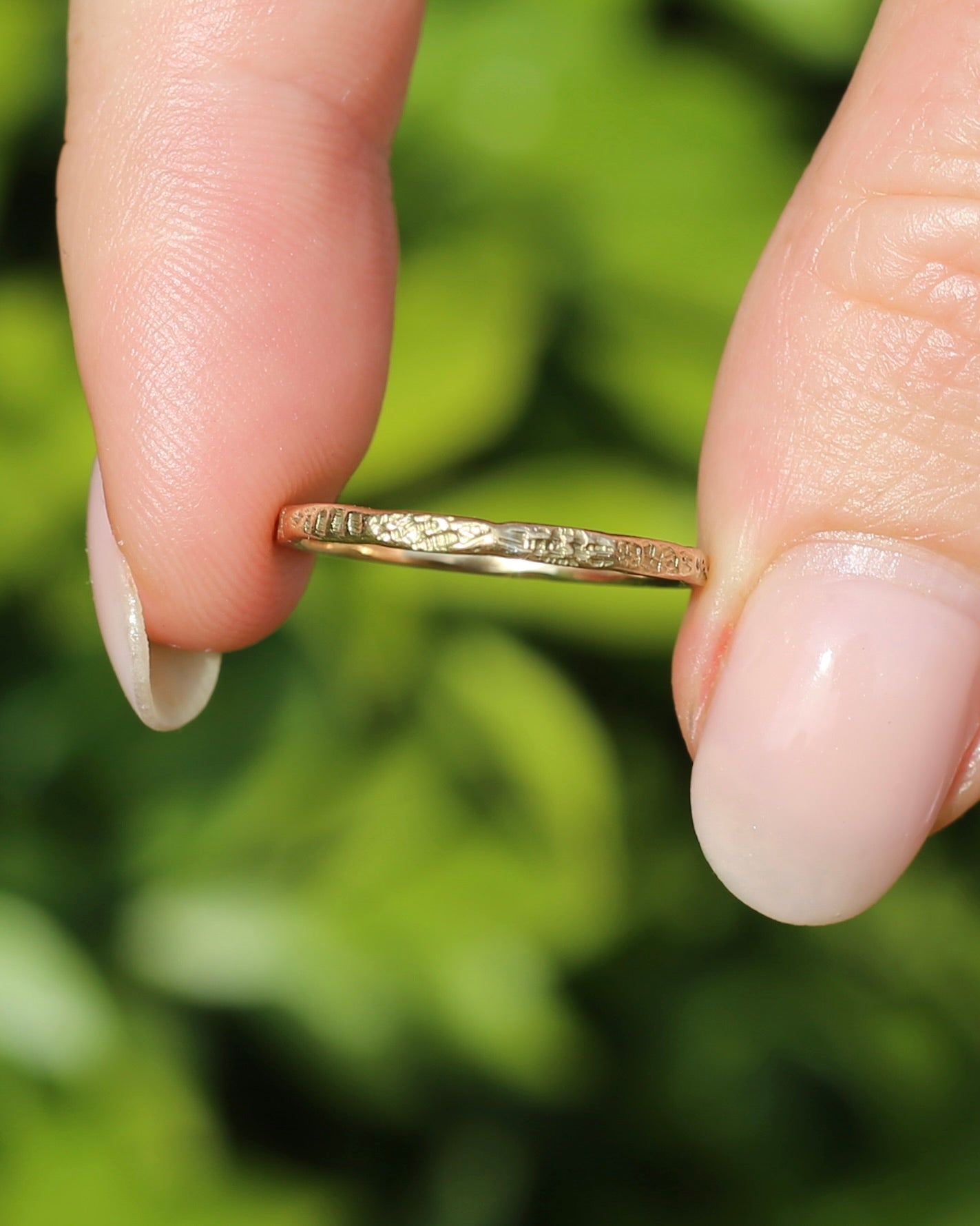 With the ever rising prices of gold we love it when we come across a vintage piece with tonnes of personality and not a killer price tag. This vintage gold ring is likely Australian made and definitely more than 50 years old (thanks to those hallmarks) and features a set of textured flat panels all the way around the ring. She is a stunner, and an amazing stacker.