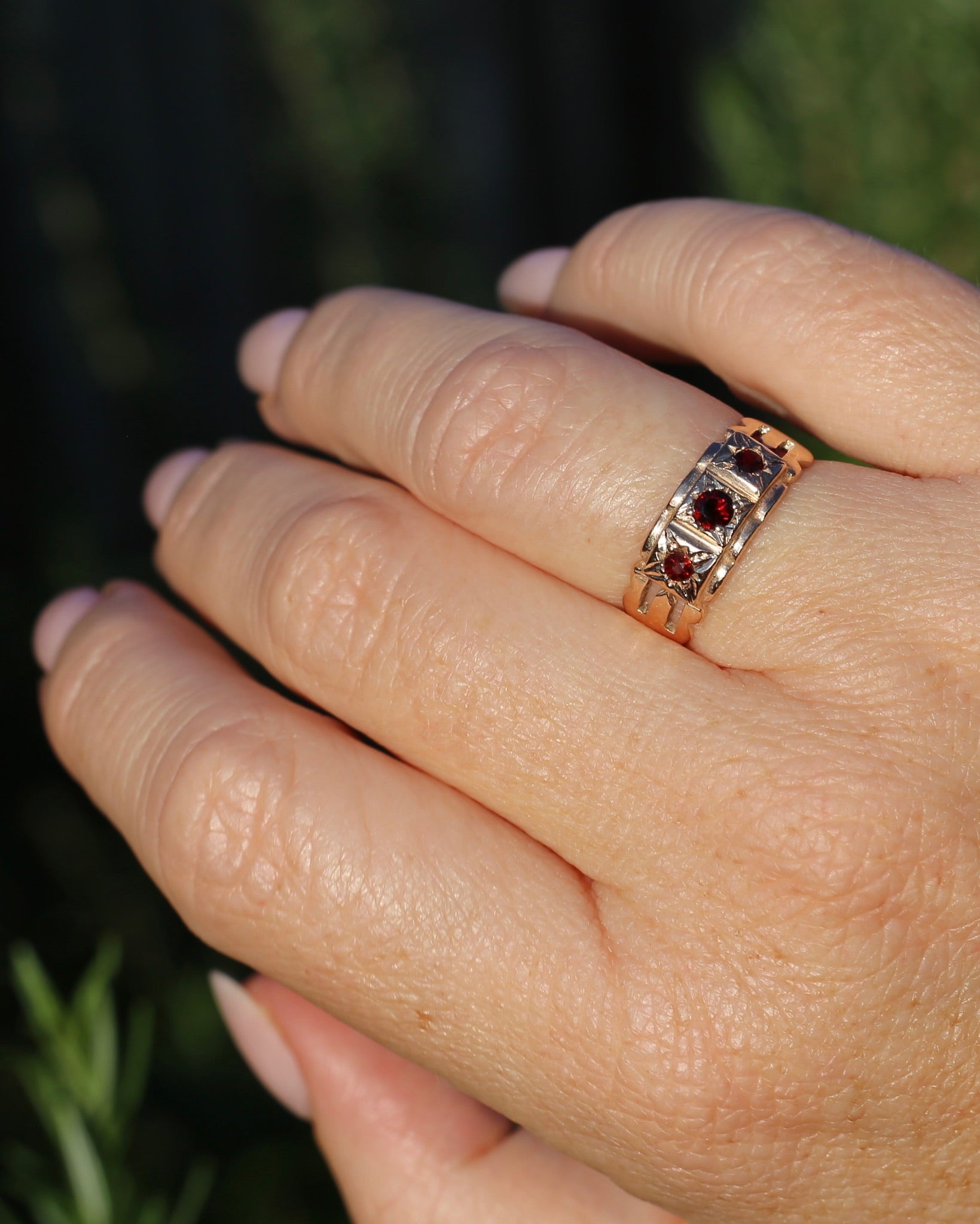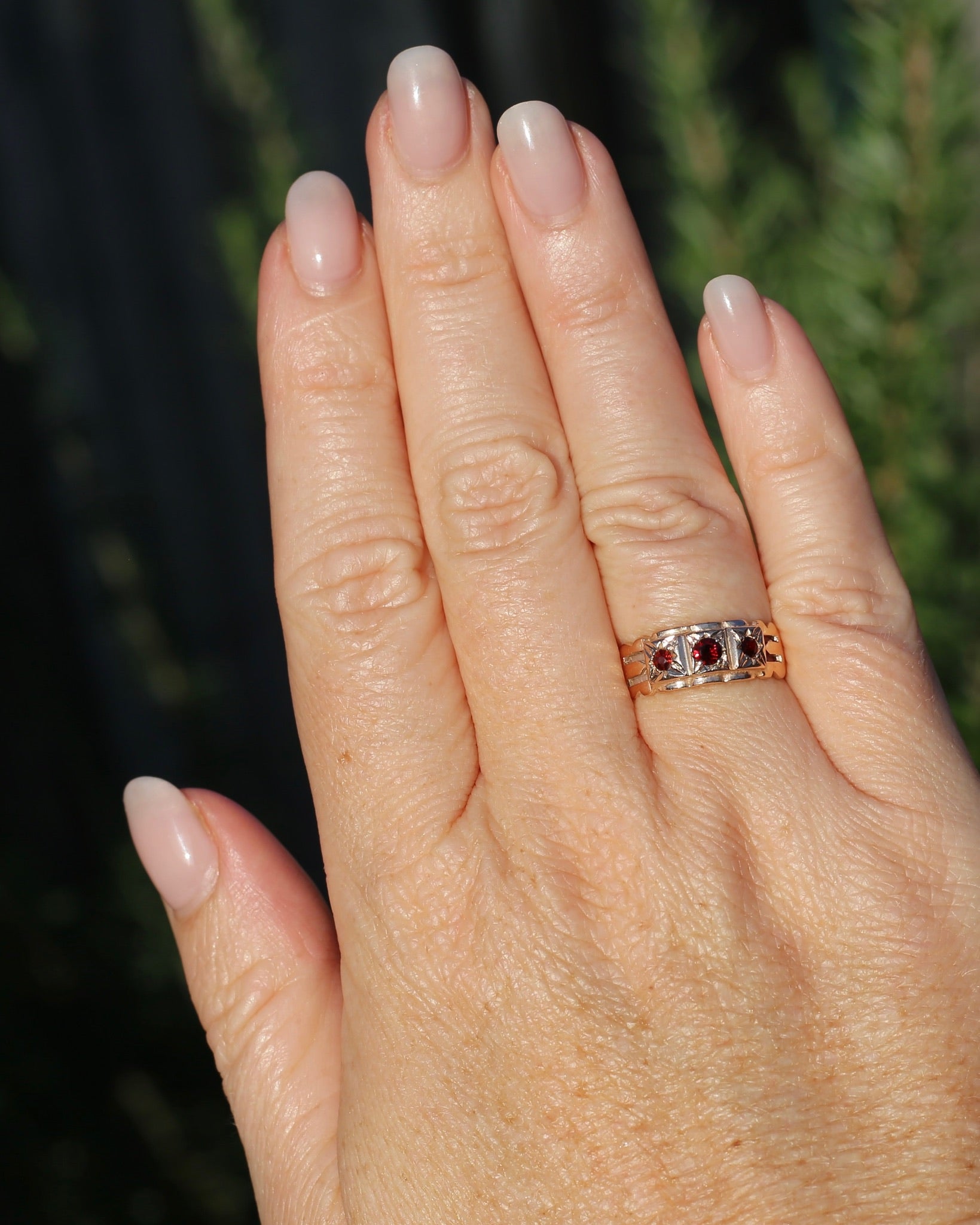 Set with three vibrant garnets this ring sings with the rich autumnal fires of red and orange. Some garnets are dull and dark (and quite frankly give this amazing stone a bad name), but not these firecrackers. Against the rich rosey gold they really are a fabulous pairing of Autumnal hues.