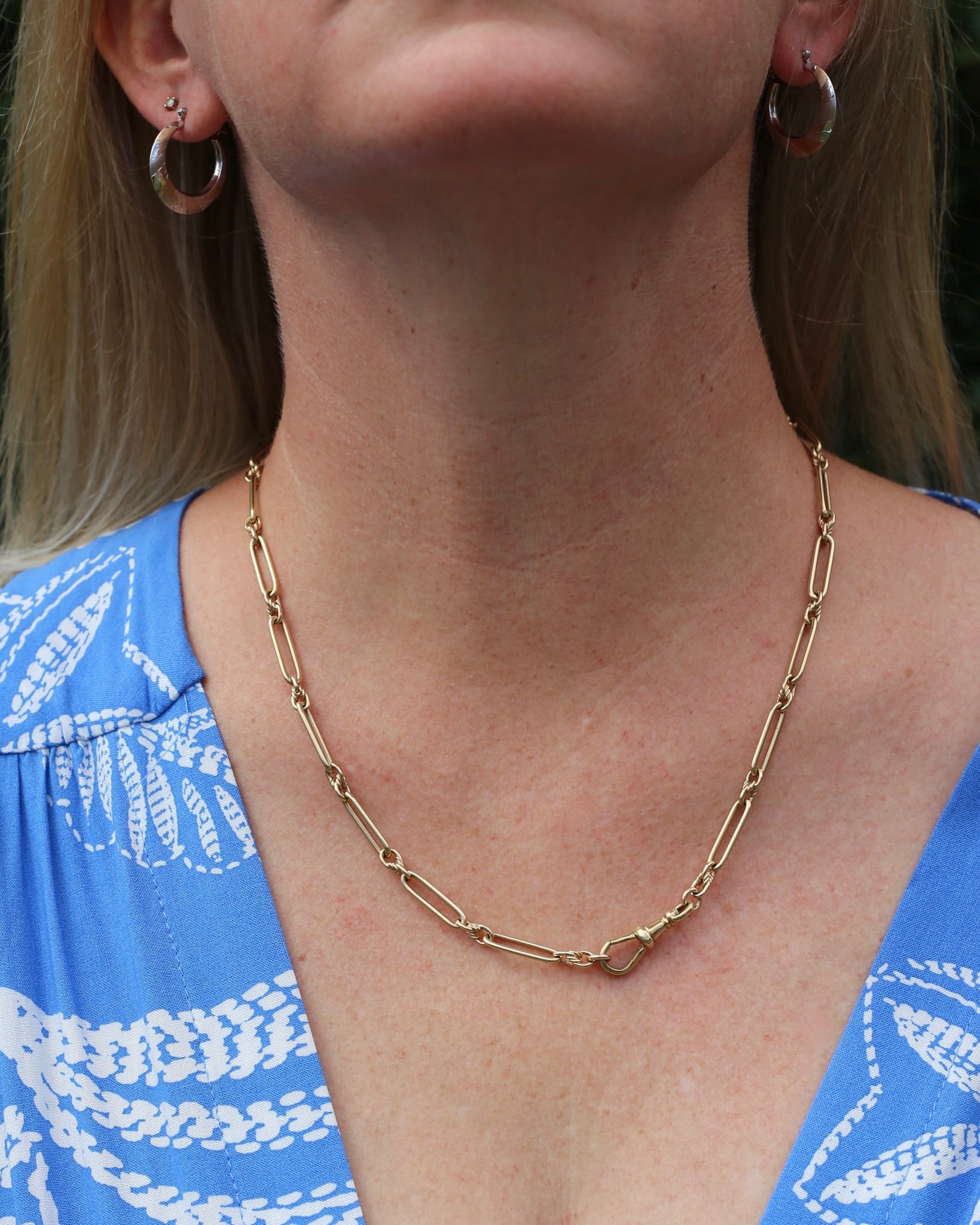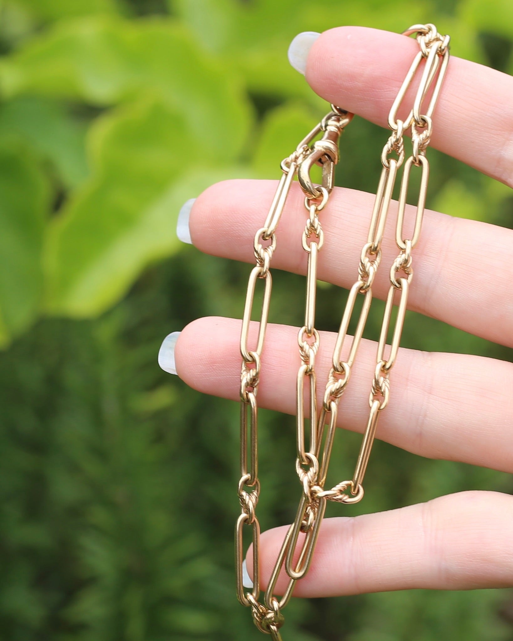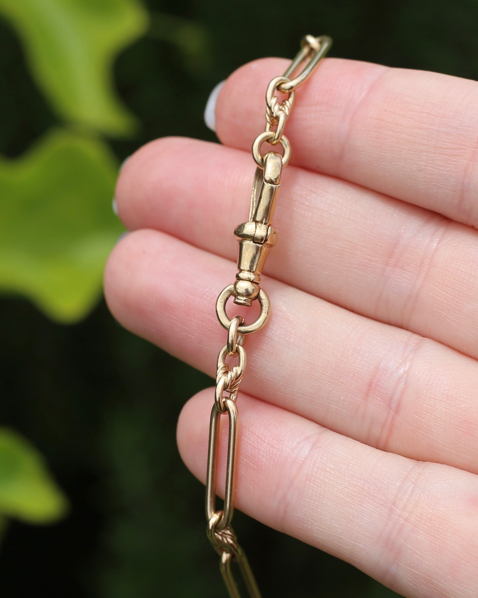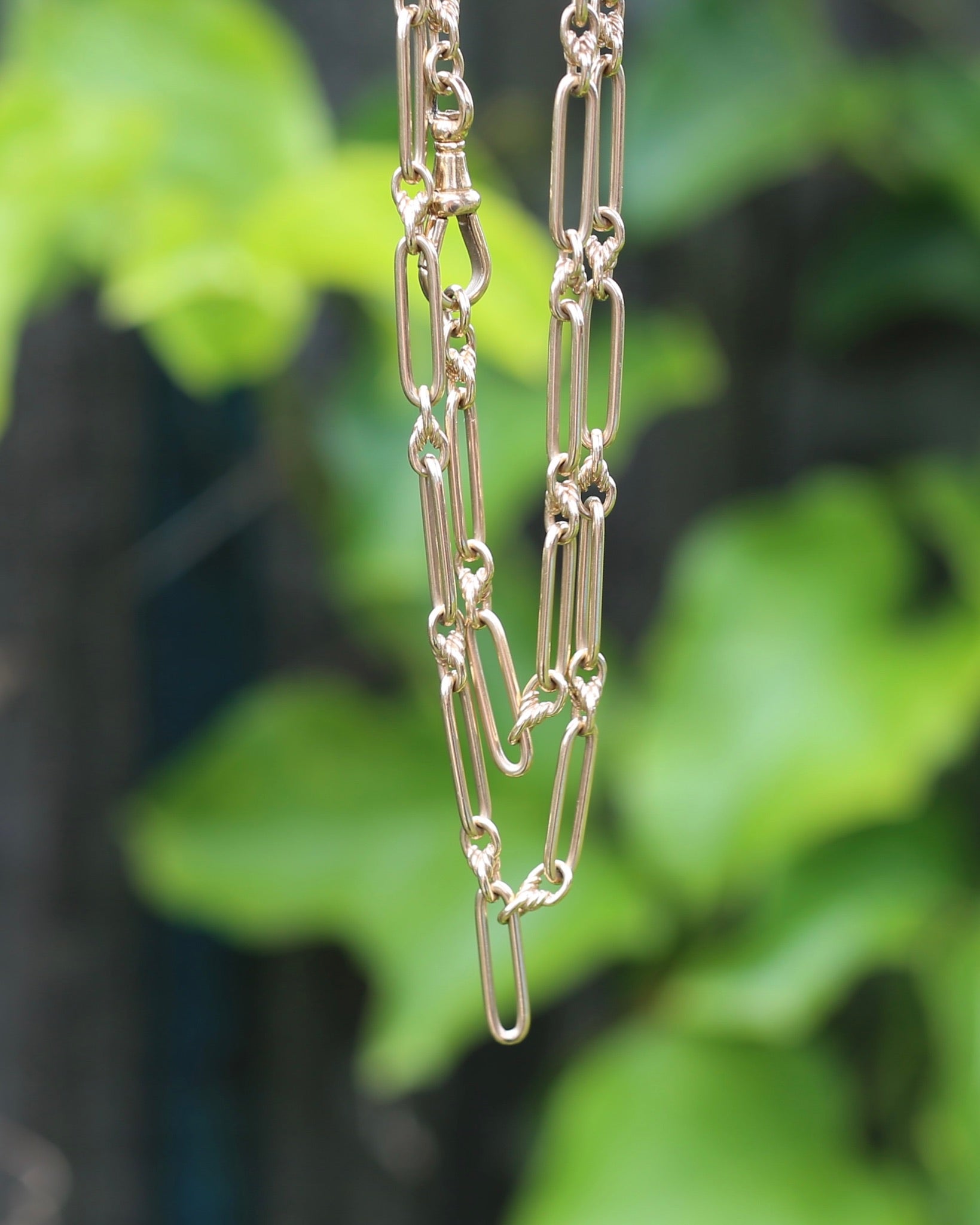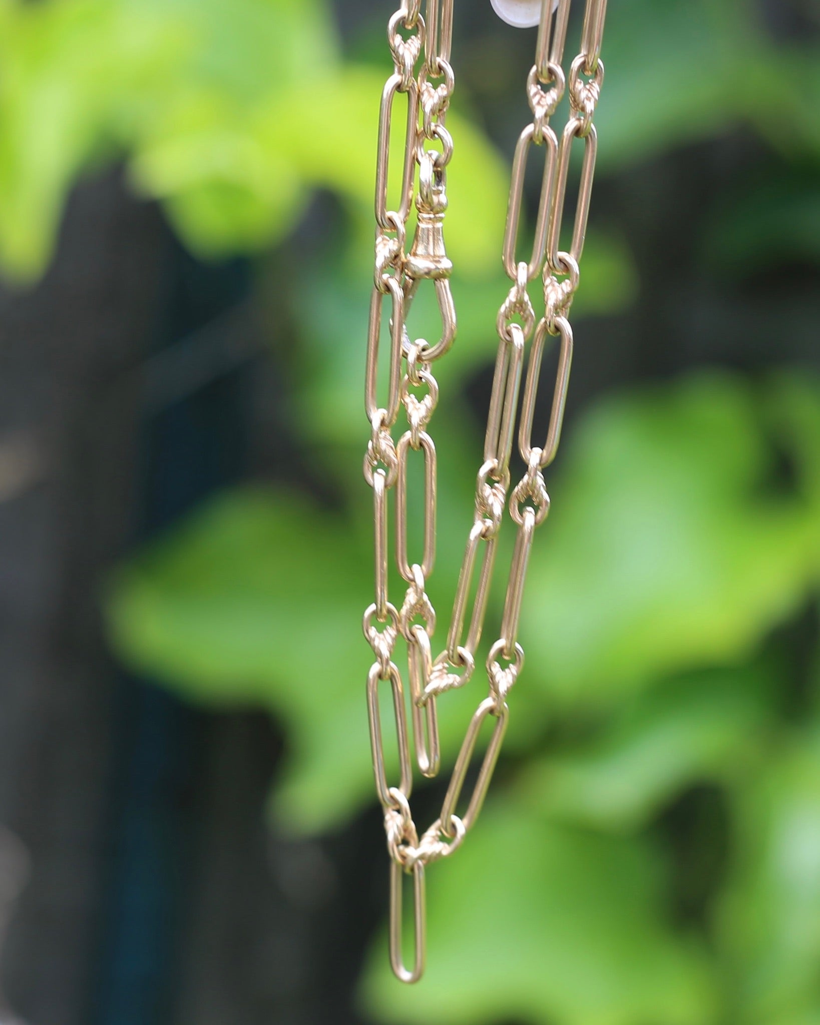 This glorious chain is the perfect length and a fabulous weight, and with the shape of the links you can wear it full length or with the large Albert clasp clipped through one of the trombones making it into a lariat necklace.